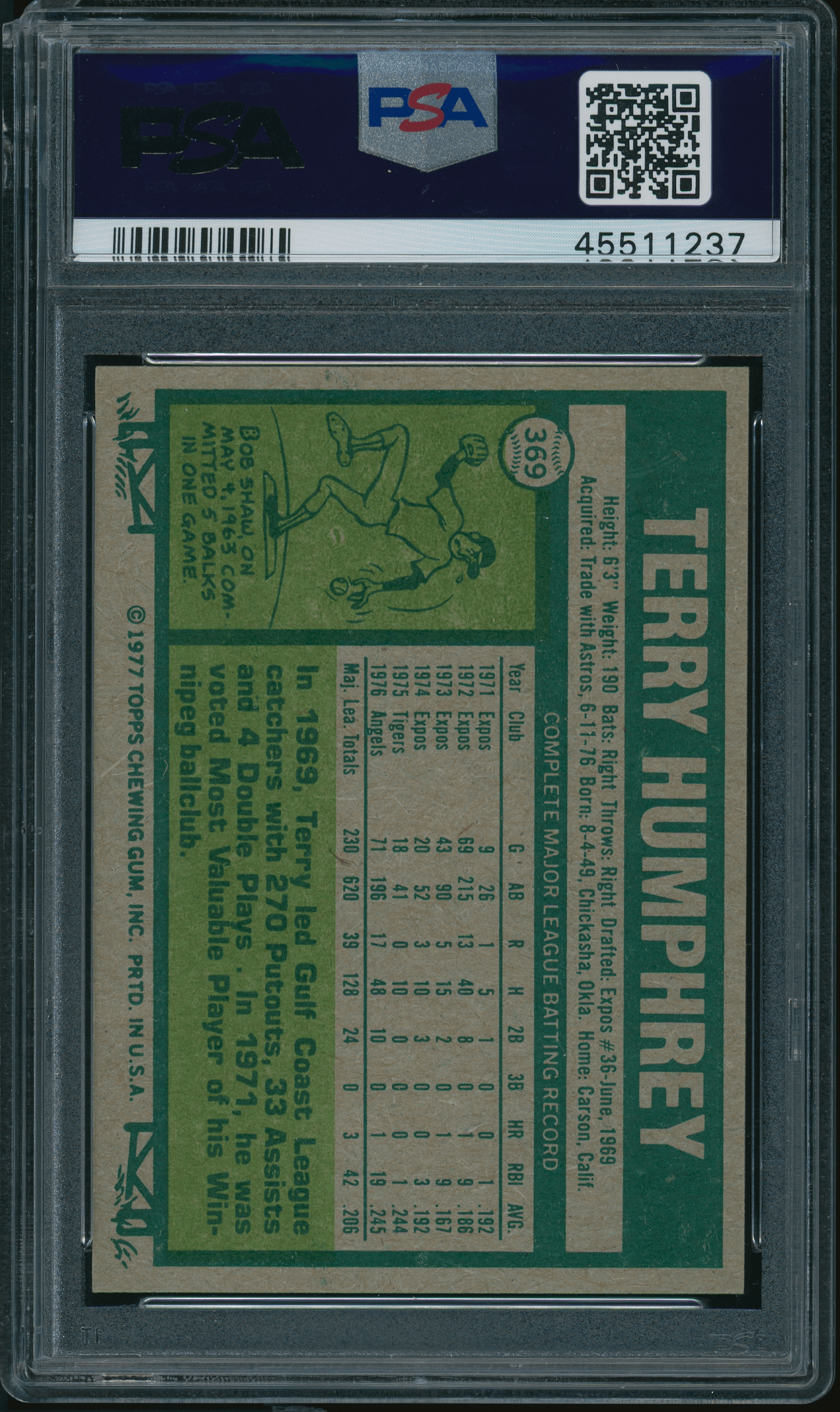 1977 Topps #369 Terry Humphrey PSA 9 MINT