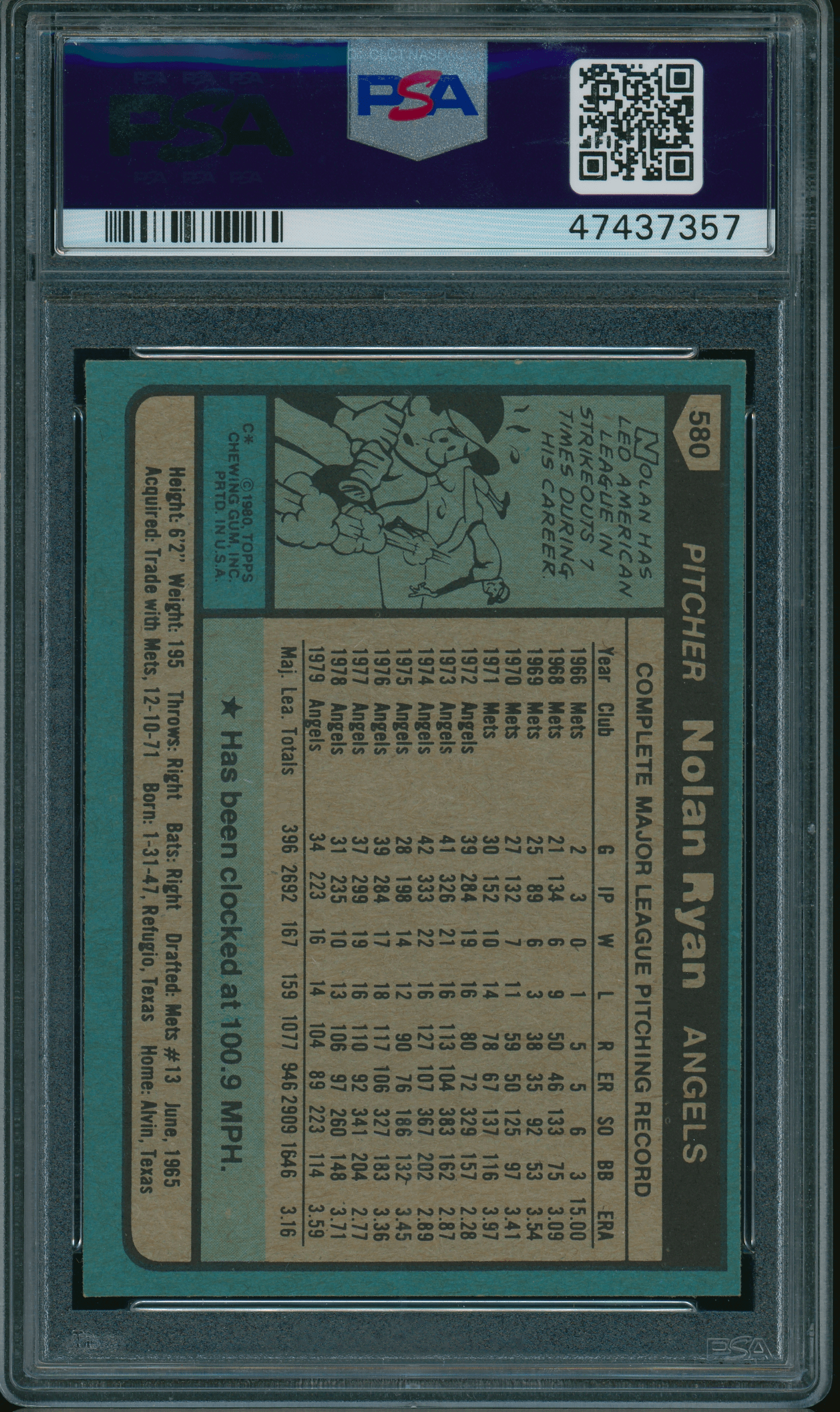 Home / Shop / Cards / Baseball / Angels / 1980 Topps #580 Nolan Ryan PSA 9 MINT1980 Topps #580 Nolan Ryan PSA 9 MINTRelated products Baseball , Cards 1977 Topps #10 Reggie Jackson Yankees PSA 9 MINT Baseball , Cards 1989 Bowman #211 Tino Martinez RC Yankees PSA 10 GEM MT All-Star Cups , Baseball 2018 Topps Heritage #25 Aaron Judge PSA 10 Baseball , Cards 2019 Topps Living #259 Thurman Munson Yankees PSA 10 GEM MT