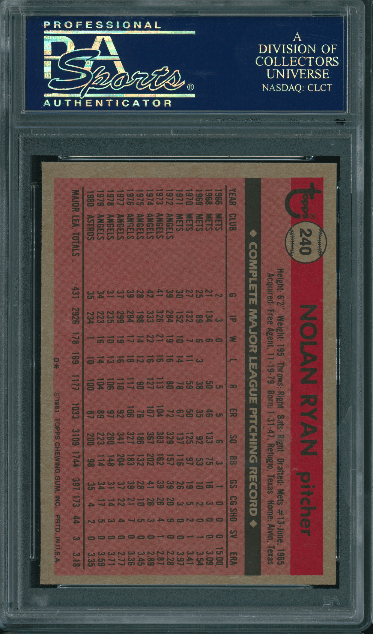1981 Topps #240 Nolan Ryan PSA 9 MINT