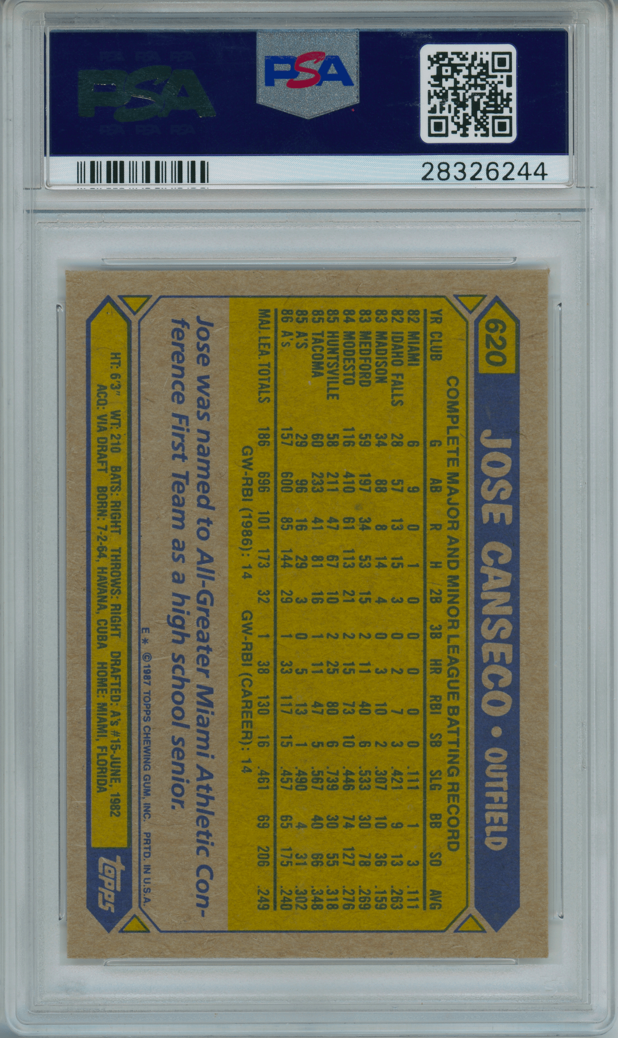 Home / Shop / Cards / Baseball / Athletics / 1987 Topps #620 Jose Canseco Rookie Cup PSA 10 GEM MINT1987 Topps #620 Jose Canseco Rookie Cup PSA 10 GEM MINTRelated products Baseball , Cards 1961 Topps #388 Roberto Clemente Pirates PSA 8++ Centered1961 Topps #388 Roberto Clemente Pirates PSA 8++ Centered Baseball , Cards 1970 Kelloggs #7 Tom Seaver Mets PSA 10 GEM MT Baseball , Cards 1986 Topps Tiffany #159 Orel Hershiser Dodgers PSA 9 MINT Baseball , Cards 1977 Topps #640 Carlton Fisk Red Sox PSA 9 MINT