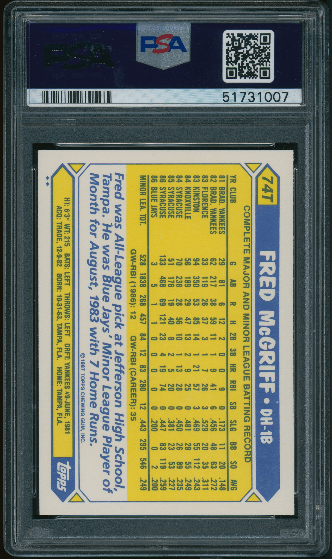1987 Topps Traded #74T Fred McGriff PSA 10 GEM MINT
