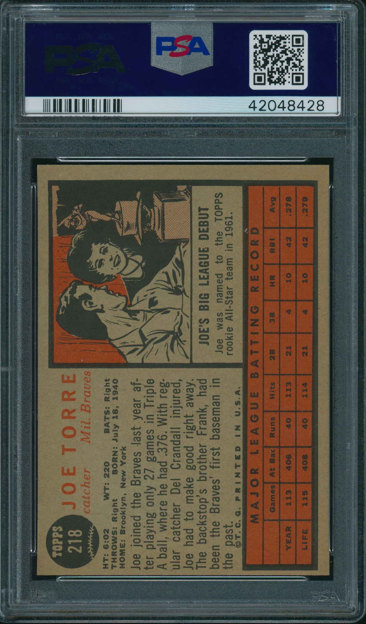 1962 Topps #218 Joe Torre All-Star Rookie PSA 7++ Centered