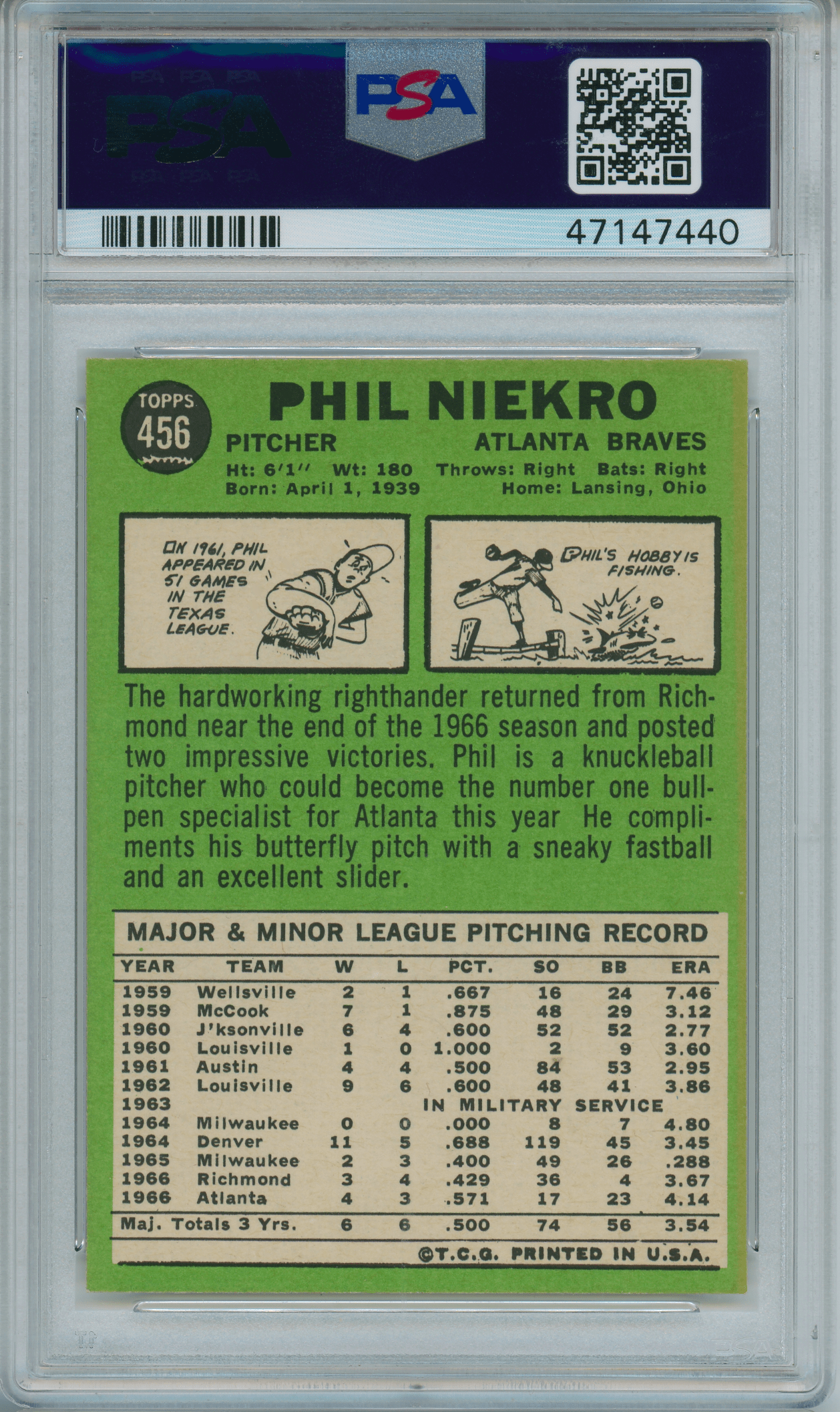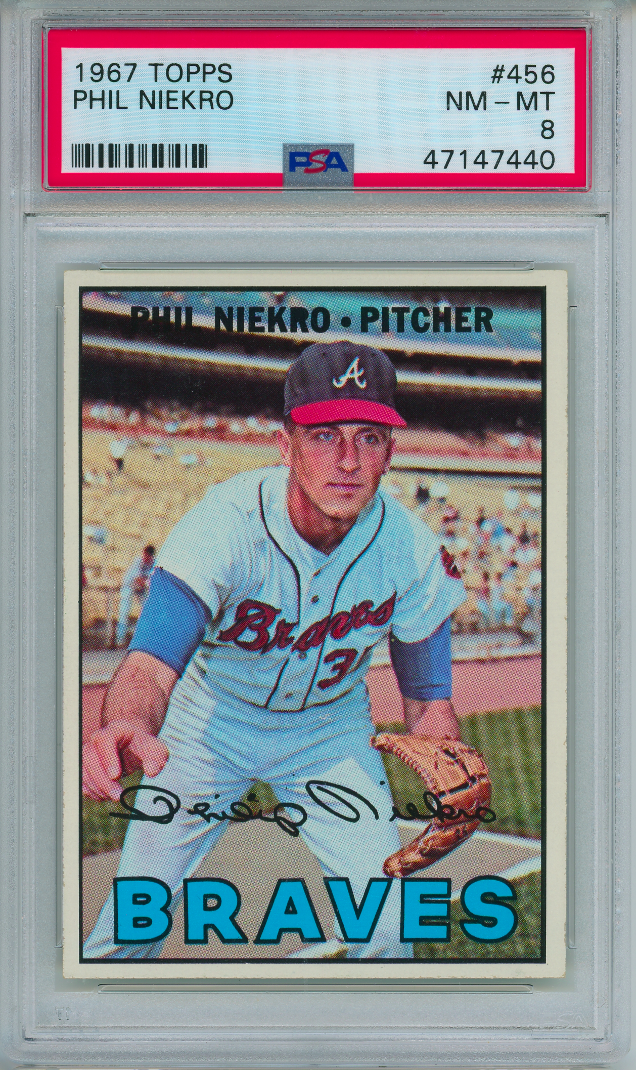 Home / Shop / Cards / Baseball / Braves / 1967 Topps #456 Phil Niekro PSA 8++1967 Topps #456 Phil Niekro PSA 8++Related products Baseball , Cards 1980 Topps #600 Reggie Jackson Yankees PSA 9 MINT Baseball , Cards 1993 Bowman #511 Derek Jeter RC Yankees PSA 10 Gem MT Baseball , Cards 1970 Kelloggs #7 Tom Seaver Mets PSA 10 GEM MT All-Star Cups , Angels 2013 Topps Heritage #430 Mike Trout PSA 10 GEM MT