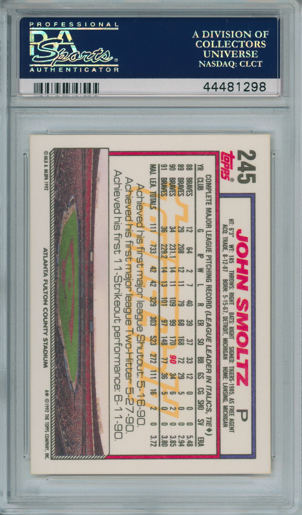 Home / Shop / Cards / Baseball / Braves / 1992 Topps Gold #245 John Smoltz Braves PSA 10 GEM MINT1992 Topps Gold #245 John Smoltz Braves PSA 10 GEM MINTRelated products All-Star Cups , Baseball 2019 Topps Heritage #413 Gleyber Torres Purple Refractor PSA 10 GEM MT Baseball , Cards 1986 Topps Tiffany #159 Orel Hershiser Dodgers PSA 9 MINT Baseball , Cards 1961 Topps #388 Roberto Clemente Pirates PSA 8++ Centered1961 Topps #388 Roberto Clemente Pirates PSA 8++ Centered All-Star Cups , Angels 2013 Topps Heritage #430 Mike Trout PSA 10 GEM MT