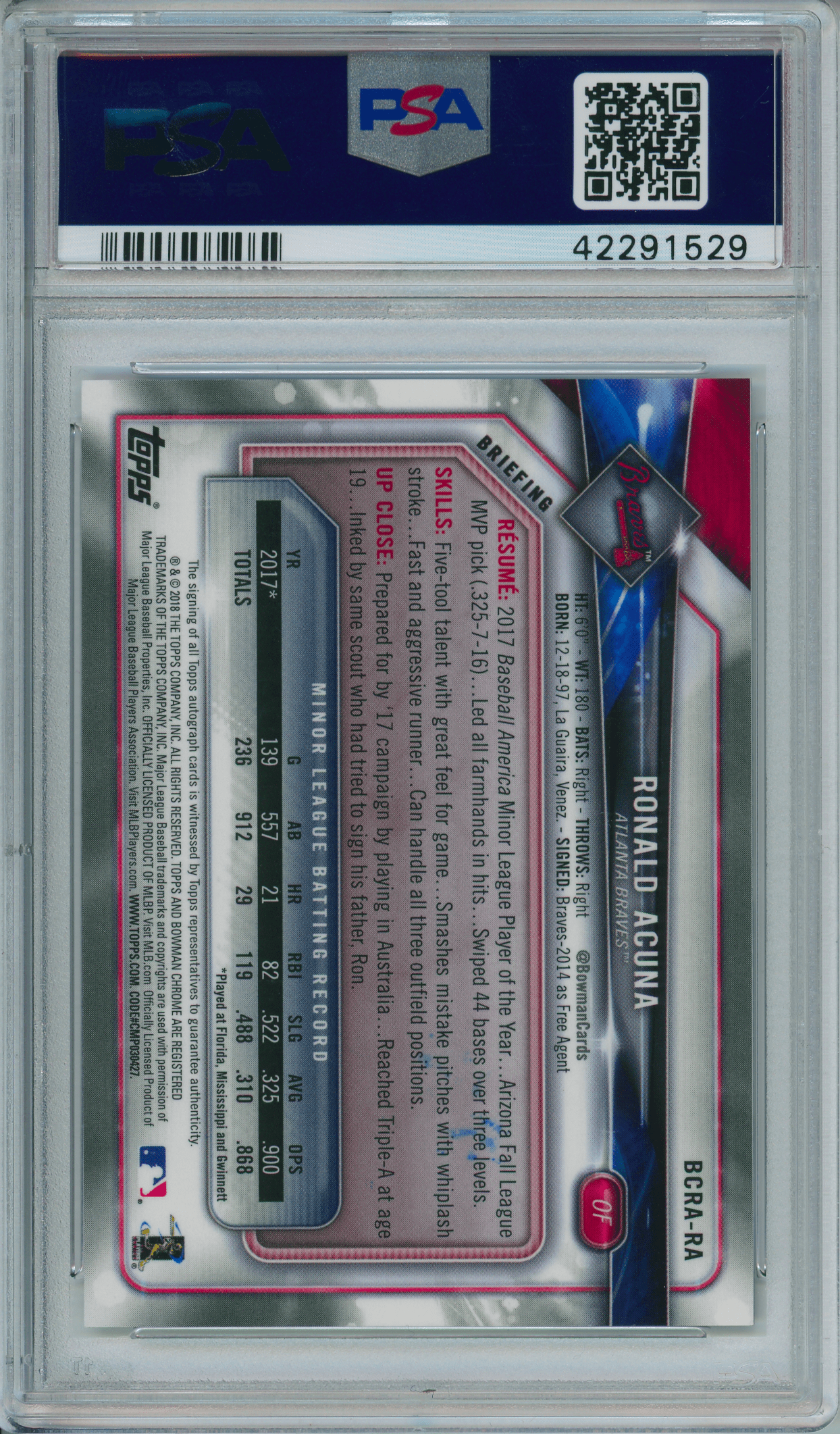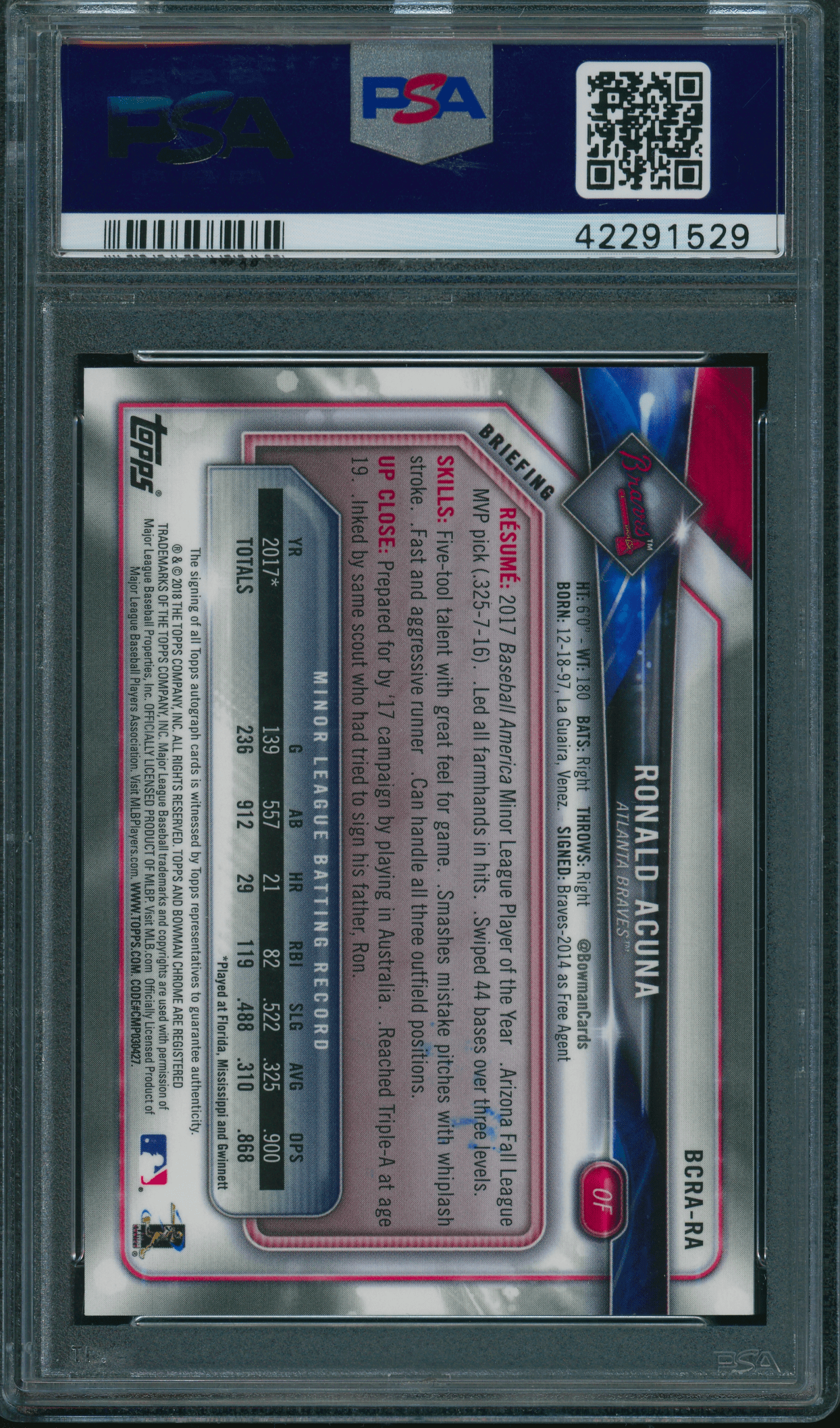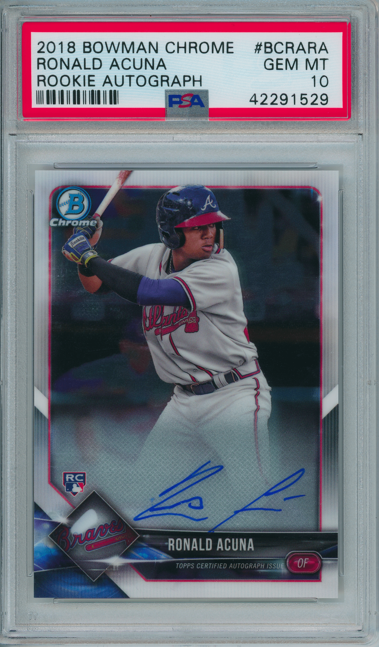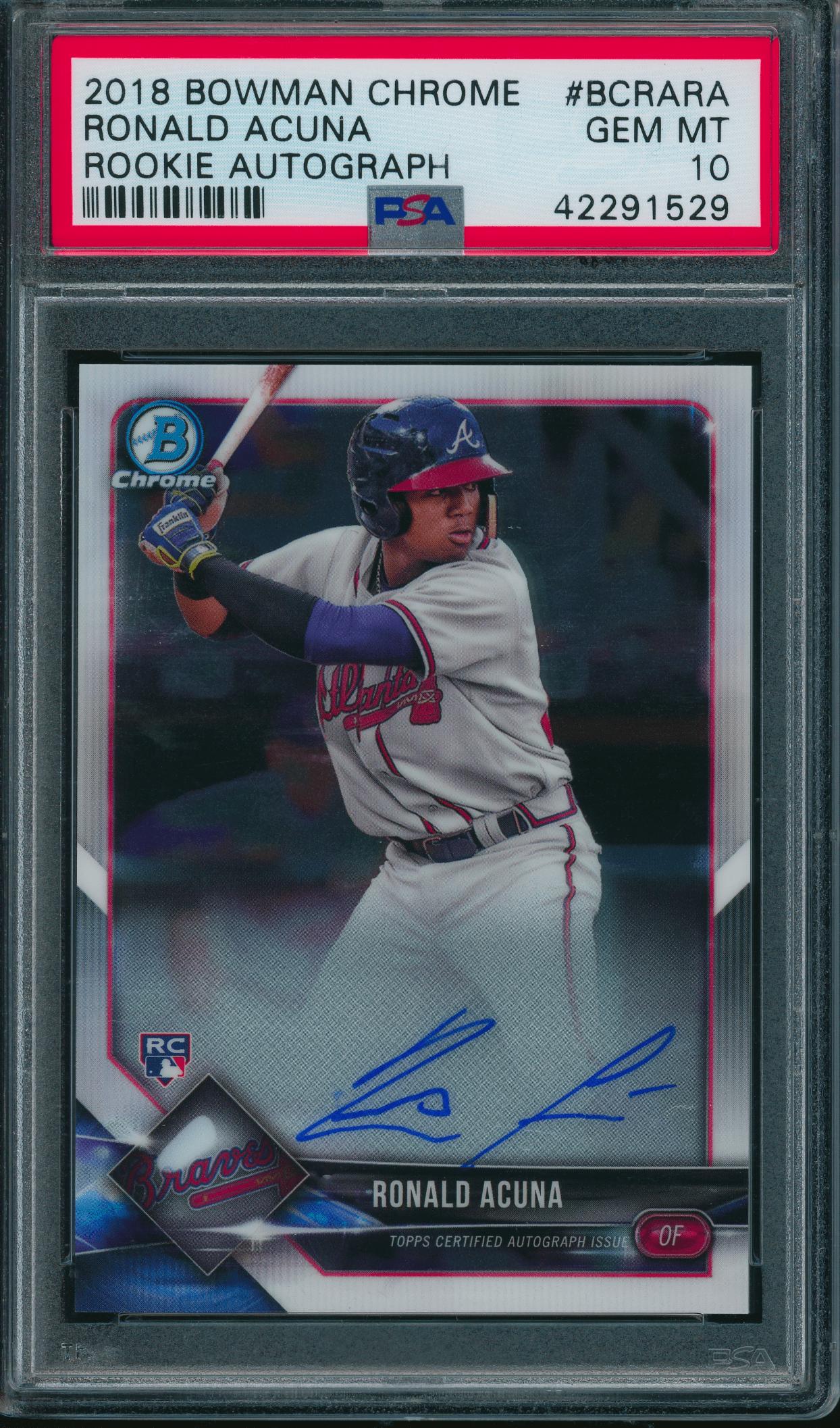 Home / Shop / Cards / Baseball / Rookie Cards / 2018 Bowman Chrome #BCRARA Ronald Acuna Autograph RC PSA 10 GEM MINT2018 Bowman Chrome #BCRARA Ronald Acuna Autograph RC PSA 10 GEM MINTRelated products Baseball , Cards 1973 Topps #627 Luis Alvarado White Sox PSA 8++ Centered All-Star Cups , Baseball 2019 Topps Heritage #413 Gleyber Torres Purple Refractor PSA 10 GEM MT Baseball , Cards 1983 Topps #163 Cal Ripken Jr. Orioles PSA 10 GEM MT Baseball , Cards 1983 Topps #580 Tom Seaver Reds PSA 10 GEM MT