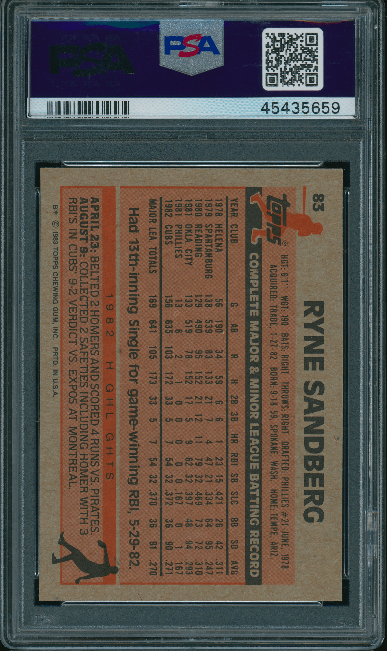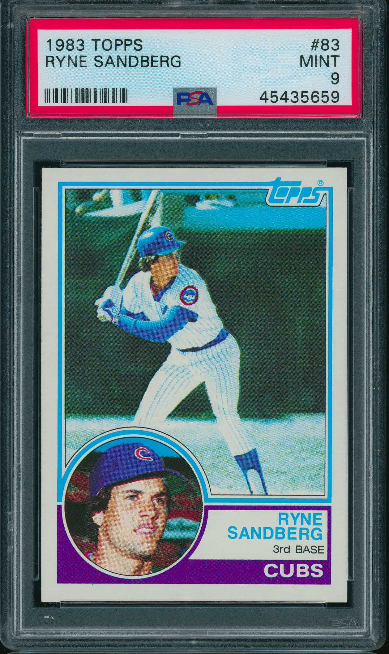 Home / Shop / Cards / Baseball / Cubs / 1983 Topps #83 Ryne Sandberg RC PSA 9++1983 Topps #83 Ryne Sandberg RC PSA 9++Related products Baseball , Cards 1983 Topps #163 Cal Ripken Jr. Orioles PSA 10 GEM MT Baseball , Cards 1984 Topps Traded #42T Dwight Gooden RC Rookie PSA 10 GEM MT All-Star Cups , Baseball 2019 Topps Heritage #413 Gleyber Torres Purple Refractor PSA 10 GEM MT All-Star Cups , Baseball 1969 Topps #95 Johnny Bench All-Star Rookie Reds PSA 8++ Centered