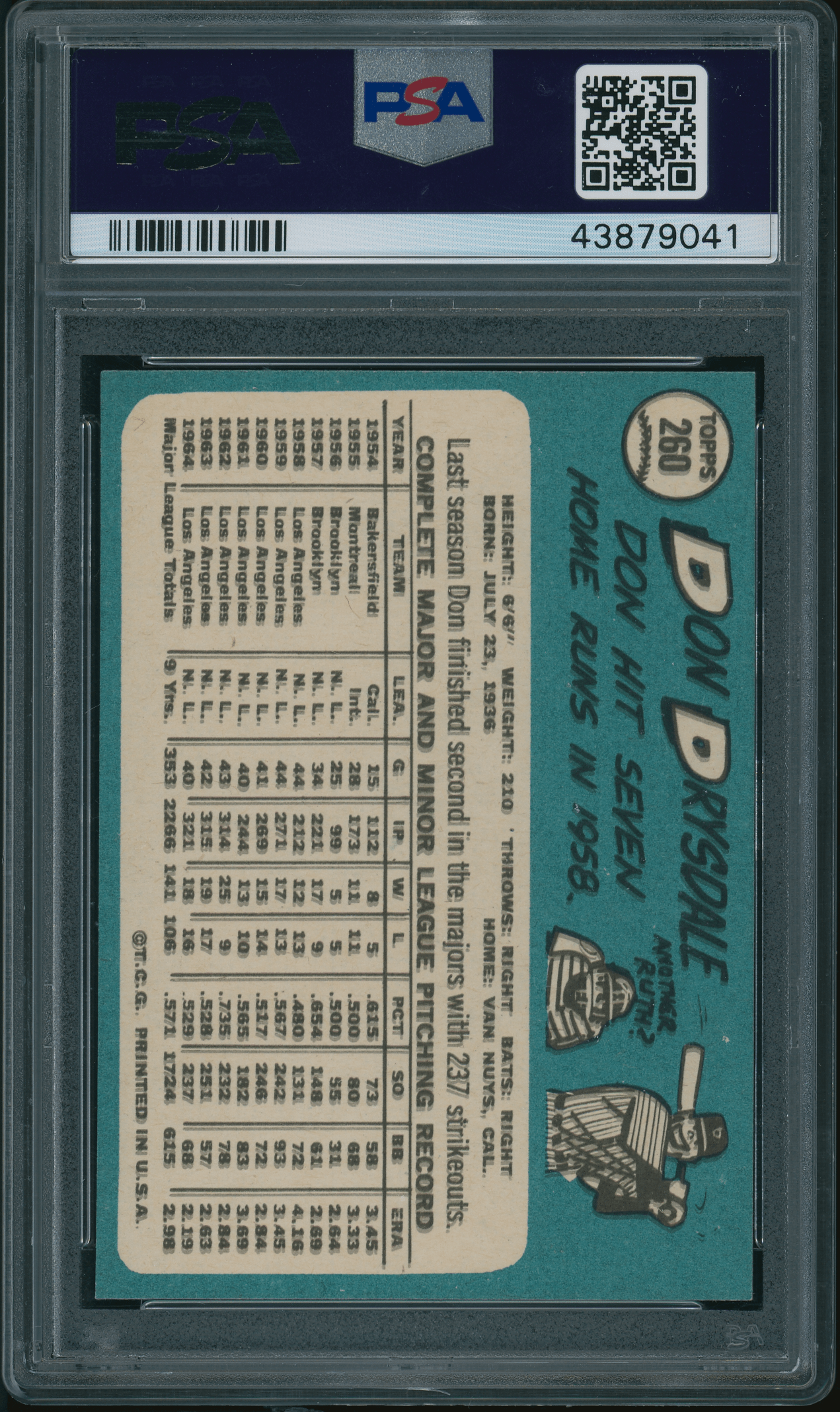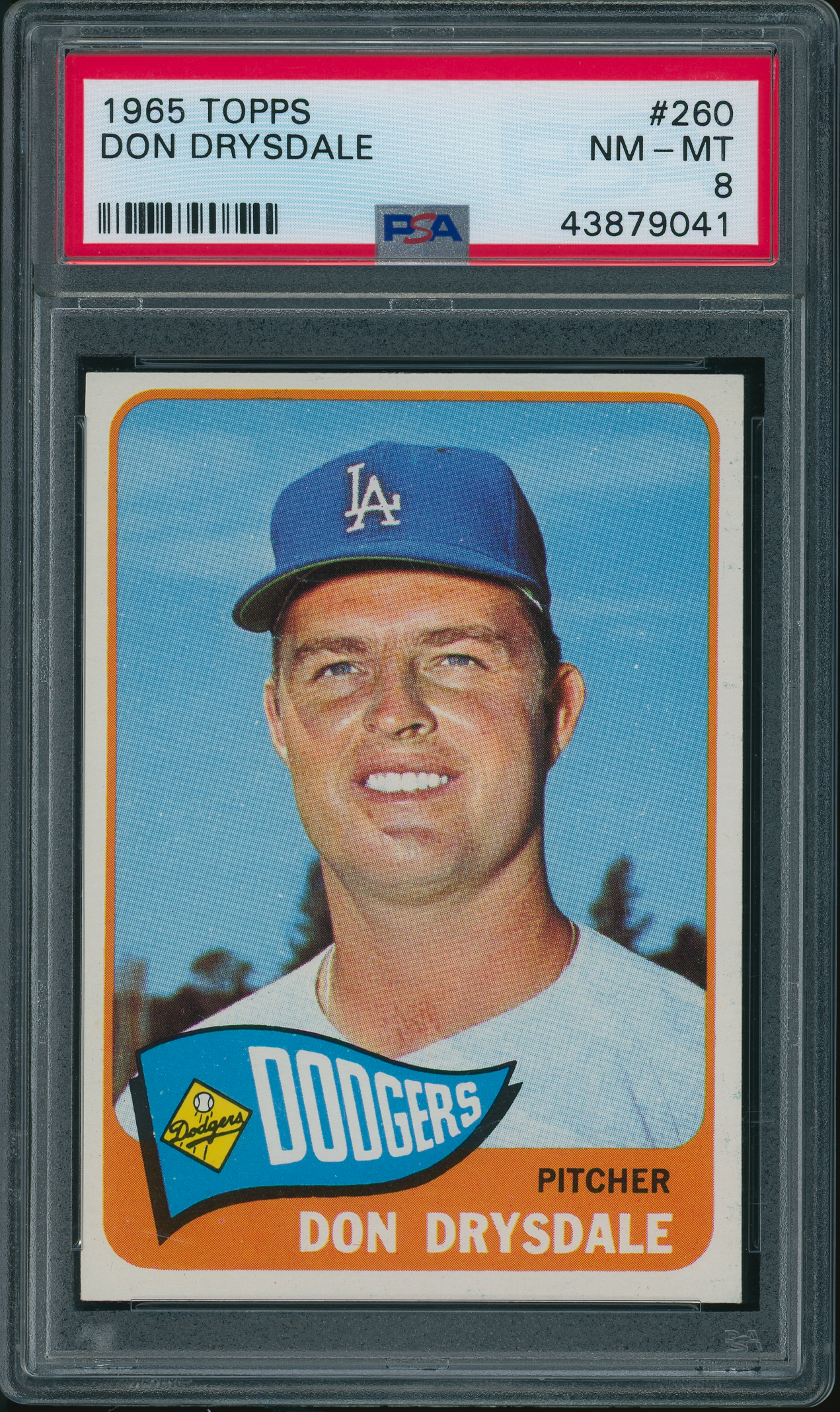 Home / Shop / Cards / Baseball / Dodgers / 1965 Topps #260 Don Drysdale PSA 8 NM-MT1965 Topps #260 Don Drysdale PSA 8 NM-MTRelated products Baseball , Cards 1970 Kelloggs #7 Tom Seaver Mets PSA 10 GEM MT All-Star Cups , Baseball 2019 Topps Heritage #413 Gleyber Torres Purple Refractor PSA 10 GEM MT Baseball , Cards 1958 Topps #370 Yogi Berra Yankees PSA 8++ Centered All-Star Cups , Baseball 1968 Topps #45 Tom Seaver Mets PSA 8.5