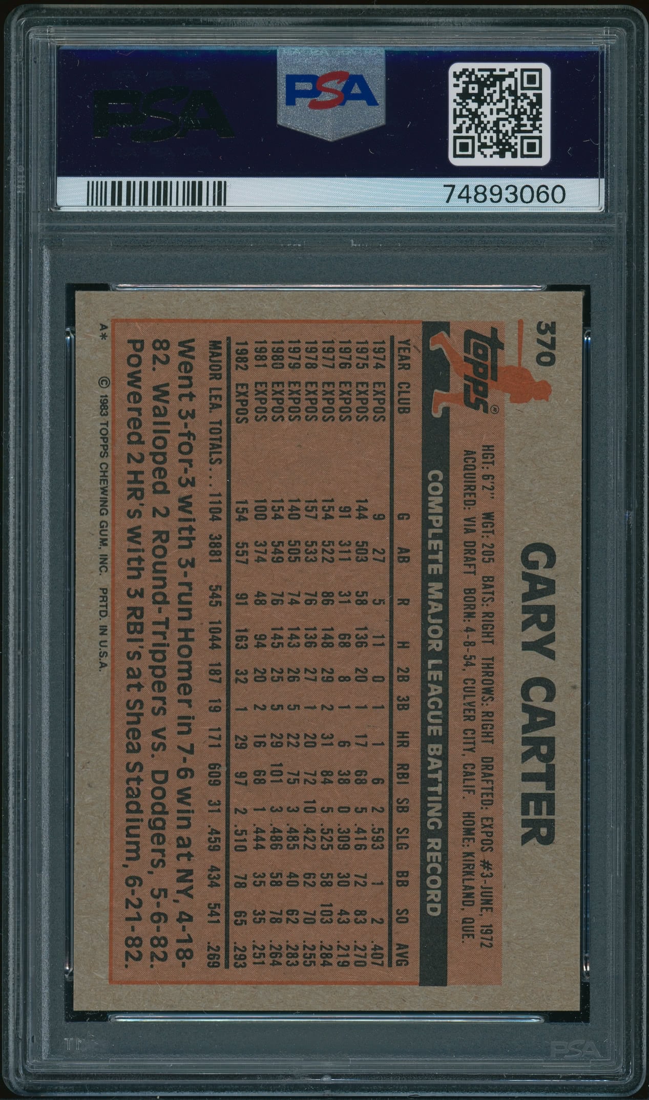 Home / Shop / Cards / Baseball / Expos / 1983 Topps #370 Gary Carter PSA 10 GEM MINT1983 Topps #370 Gary Carter PSA 10 GEM MINTRelated products Baseball , Cards 1977 Topps #640 Carlton Fisk Red Sox PSA 9 MINT Baseball , Cards 1983 Topps #580 Tom Seaver Reds PSA 10 GEM MT All-Star Cups , Baseball 1969 Topps #95 Johnny Bench All-Star Rookie Reds PSA 8++ Centered Baseball , Cards 1988 Topps Big #11 Dwight Gooden PSA 10 GEM MT