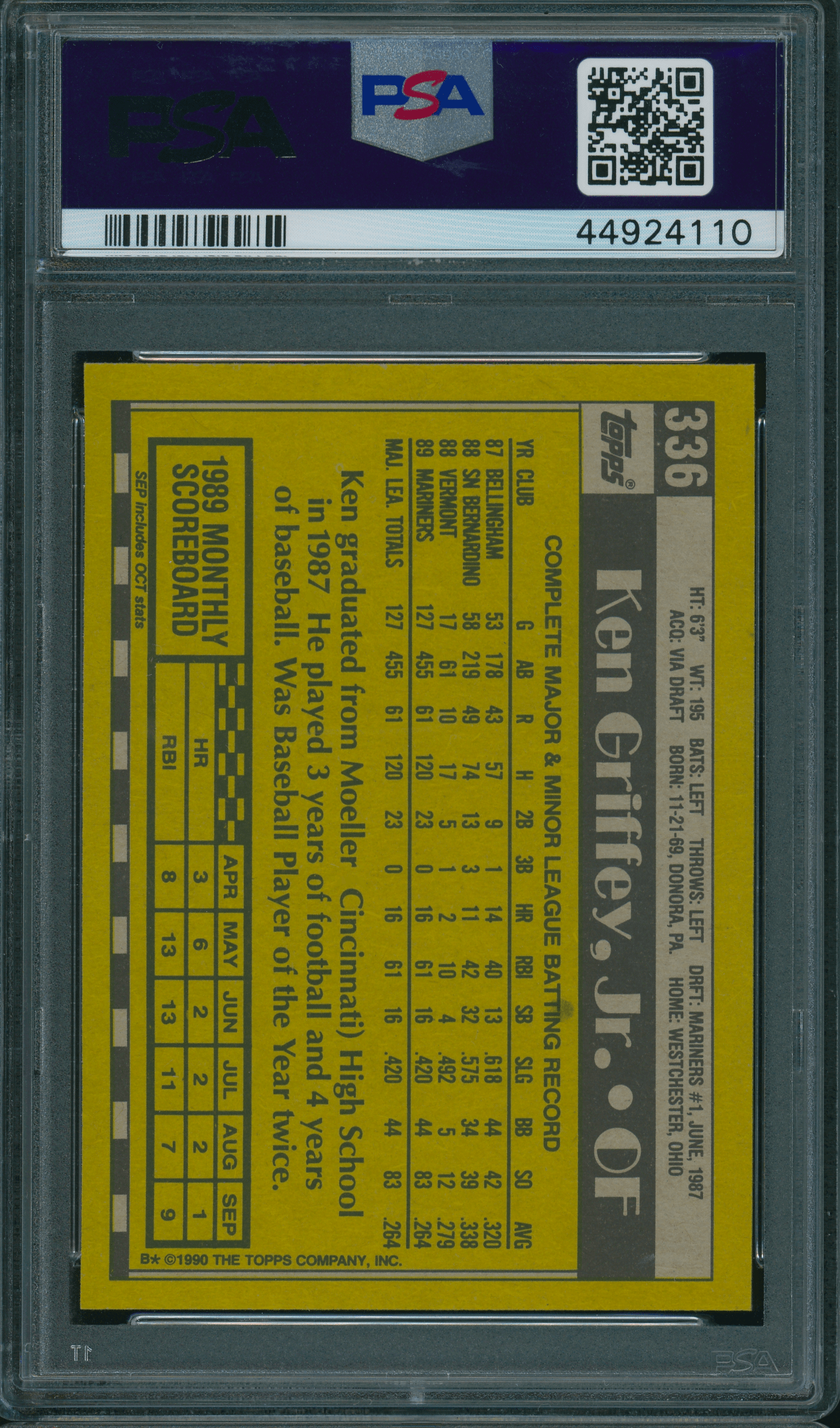 Home / Shop / Cards / Baseball / Mariners / 1990 Topps #336 Ken Griffey Jr. PSA 10 GEM MINT1990 Topps #336 Ken Griffey Jr. PSA 10 GEM MINTRelated products All-Star Cups , Baseball 1968 Topps #45 Tom Seaver Mets PSA 8.5 Baseball , Cards 1989 Bowman #211 Tino Martinez RC Yankees PSA 10 GEM MT Baseball , Cards 1970 Kelloggs #7 Tom Seaver Mets PSA 10 GEM MT Baseball , Cards 1993 Bowman #511 Derek Jeter RC Yankees PSA 10 Gem MT