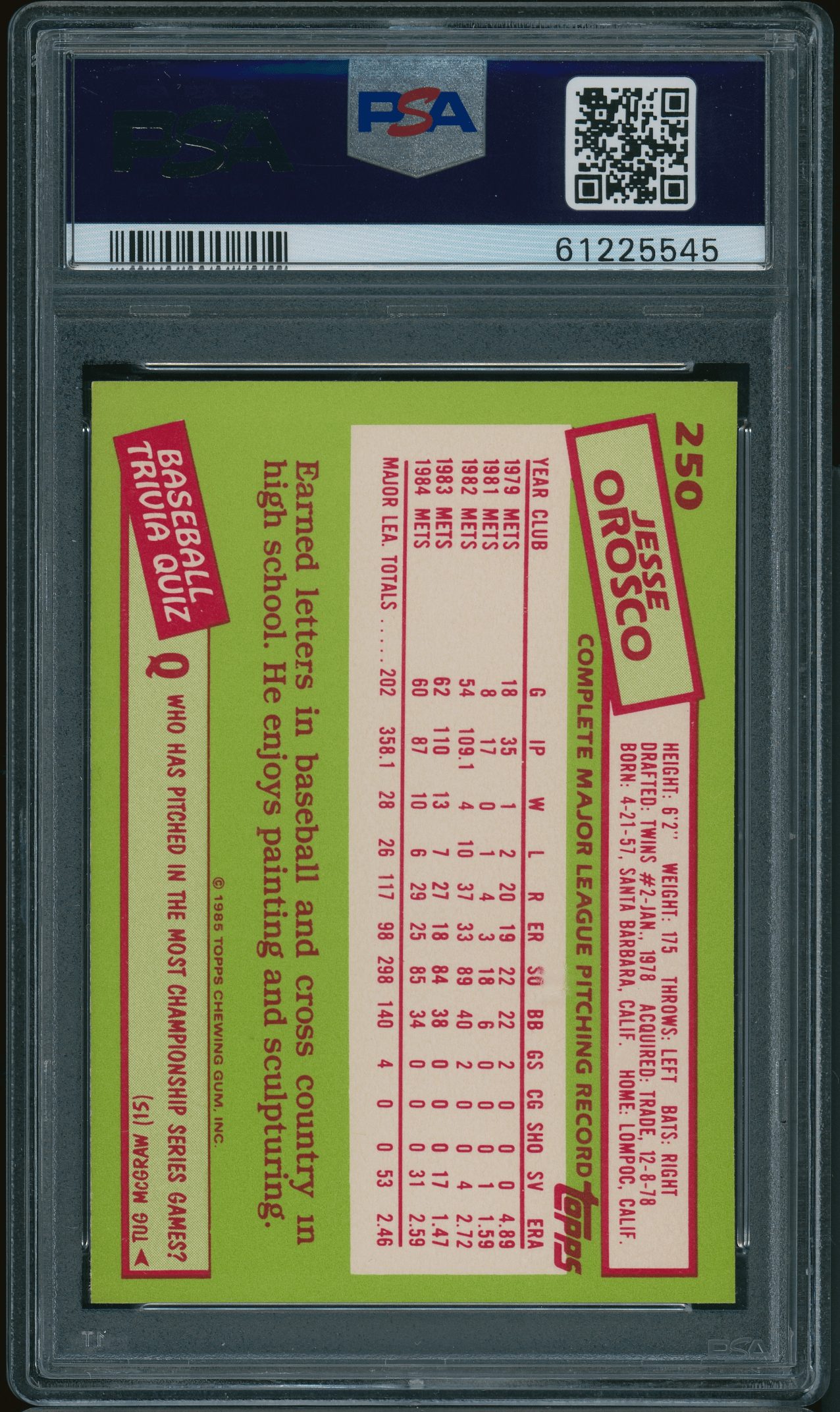 1985 Topps Tiffany #250 Jesse Orosco PSA 9 MINT