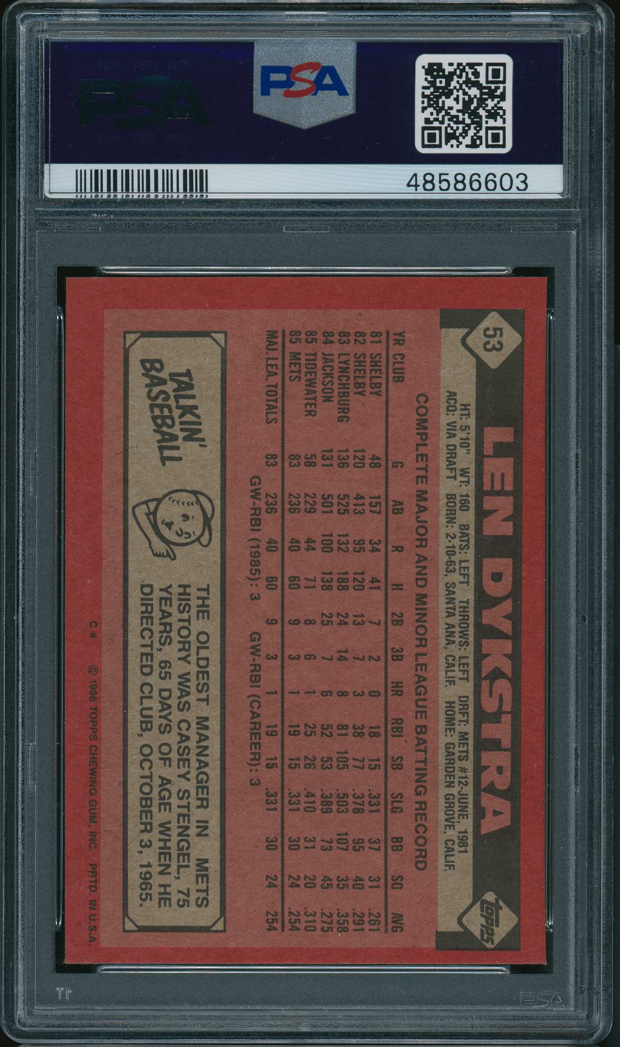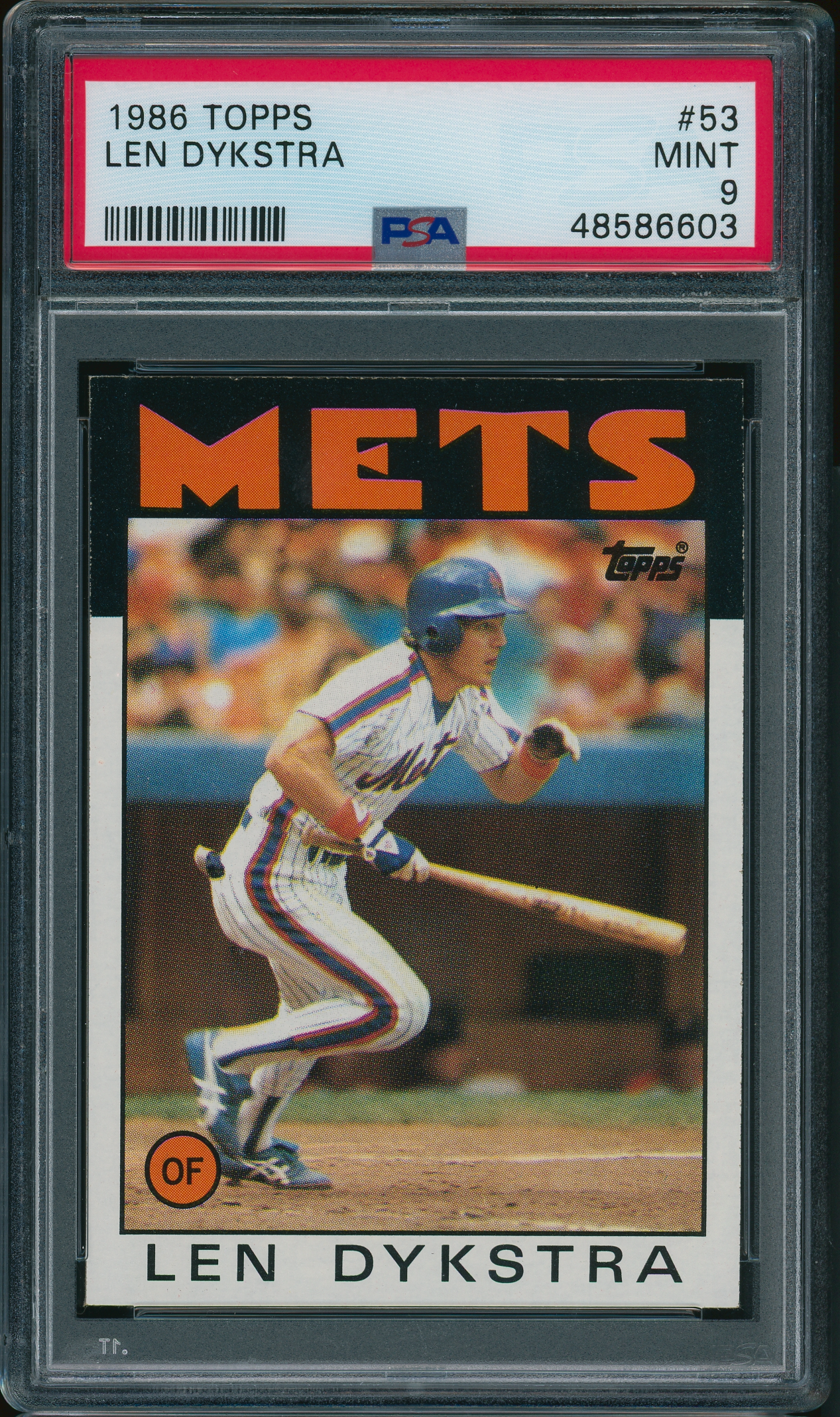 Home / Shop / Cards / Baseball / Mets / 1986 Topps #53 Lenny Dykstra Rookie RC PSA 9 MINT1986 Topps #53 Lenny Dykstra Rookie RC PSA 9 MINTRelated products Baseball , Cards 1977 Topps #10 Reggie Jackson Yankees PSA 9 MINT Baseball , Cards 1977 Topps #640 Carlton Fisk Red Sox PSA 9 MINT Baseball , Cards 1983 Topps #580 Tom Seaver Reds PSA 10 GEM MT Baseball , Cards 1977 Topps #450 Pete Rose Reds PSA 9 MINT