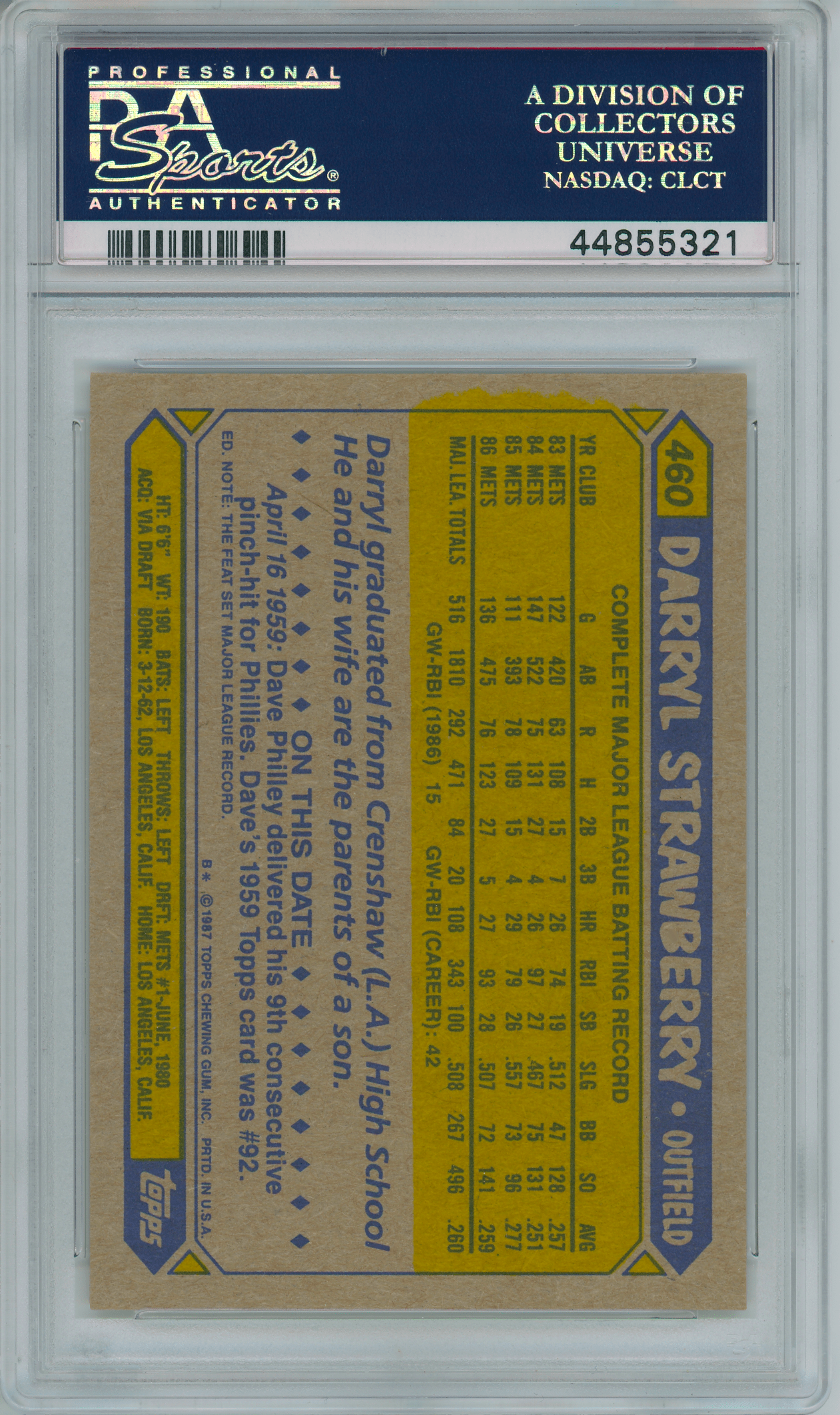 1987 Topps #460 Darryl Strawberry PSA 10 GEM MINT