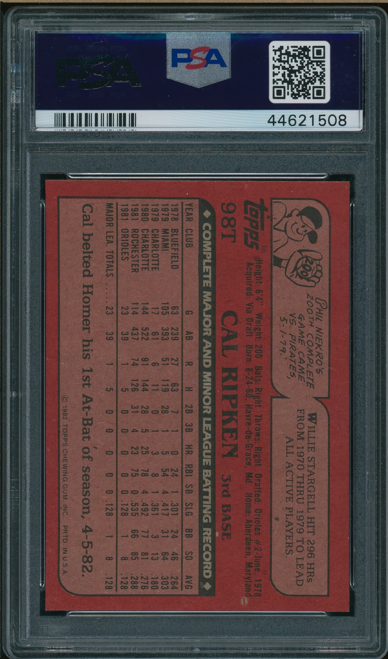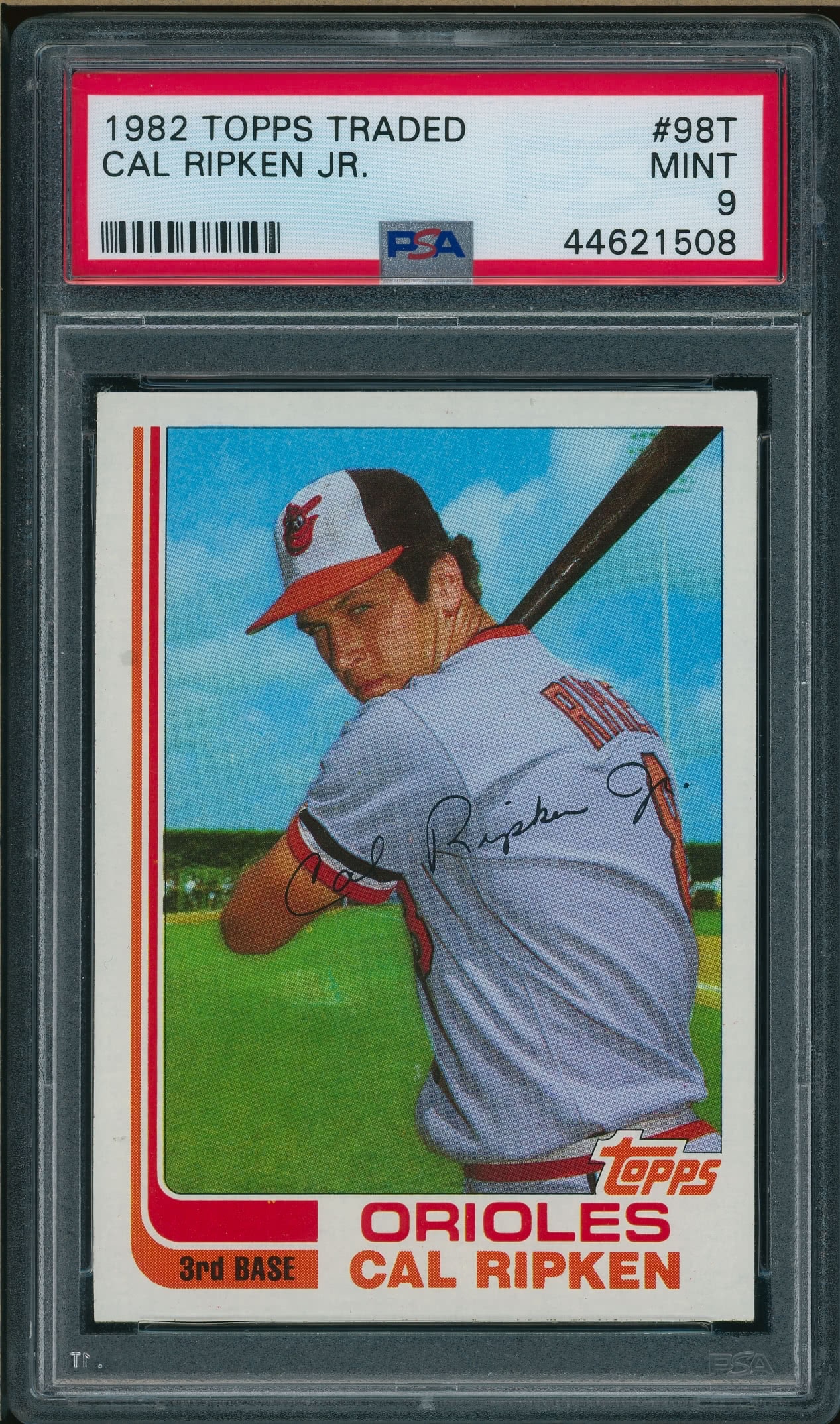 Home / Shop / Cards / Baseball / Orioles / 1982 Topps Traded #98T Cal Ripken Jr. RC PSA 9 MINT1982 Topps Traded #98T Cal Ripken Jr. RC PSA 9 MINTRelated products Baseball , Cards 1970 Kelloggs #7 Tom Seaver Mets PSA 10 GEM MT Athletics , Baseball 1974 Topps #290 Vida Blue Athletics PSA 9 MINT All-Star Cups , Baseball 2018 Topps Heritage #25 Aaron Judge PSA 10 Baseball , Cards 2019 Topps Living #259 Thurman Munson Yankees PSA 10 GEM MT