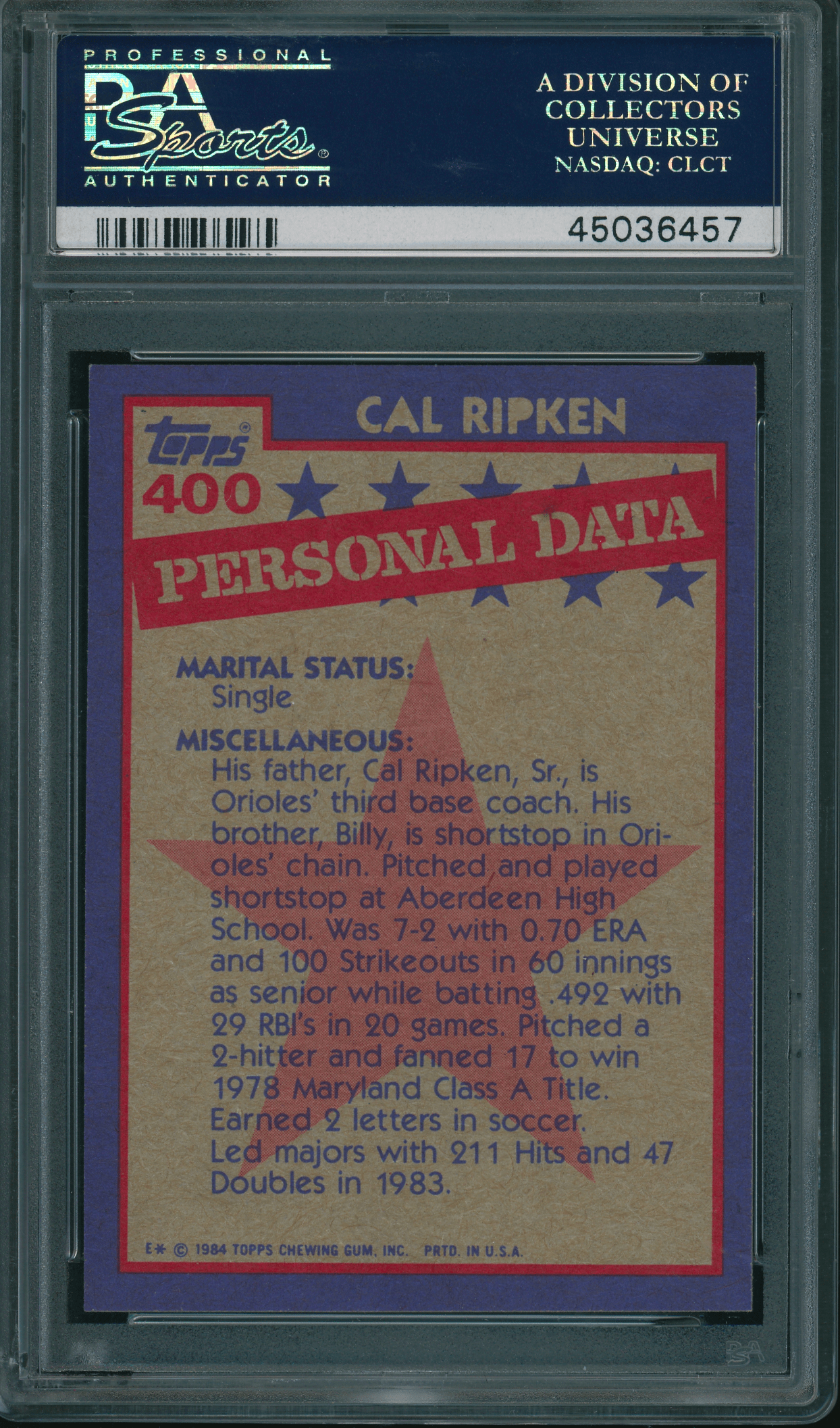 Home / Shop / Cards / Baseball / Orioles / 1984 Topps #400 Cal Ripken Jr. PSA 10 GEM MINT1984 Topps #400 Cal Ripken Jr. PSA 10 GEM MINTRelated products All-Star Cups , Baseball 2019 Topps Heritage #413 Gleyber Torres Purple Refractor PSA 10 GEM MT All-Star Cups , Baseball 1968 Topps #45 Tom Seaver Mets PSA 8.5 Baseball , Cards 1961 Topps #388 Roberto Clemente Pirates PSA 8++ Centered1961 Topps #388 Roberto Clemente Pirates PSA 8++ Centered Baseball , Cards 2019 Topps Living #259 Thurman Munson Yankees PSA 10 GEM MT