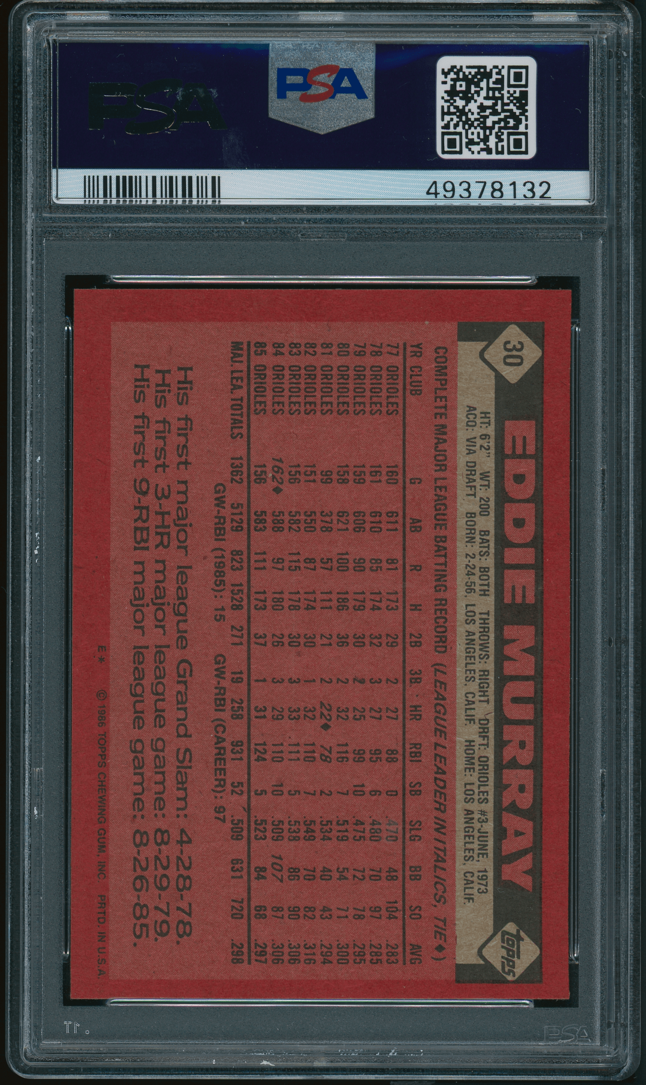 1986 Topps #30 Eddie Murray PSA 9 MINT