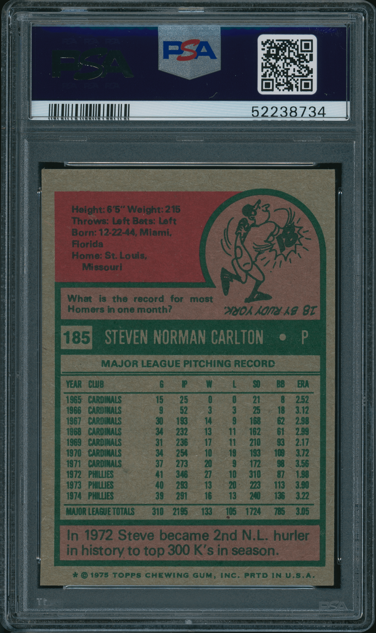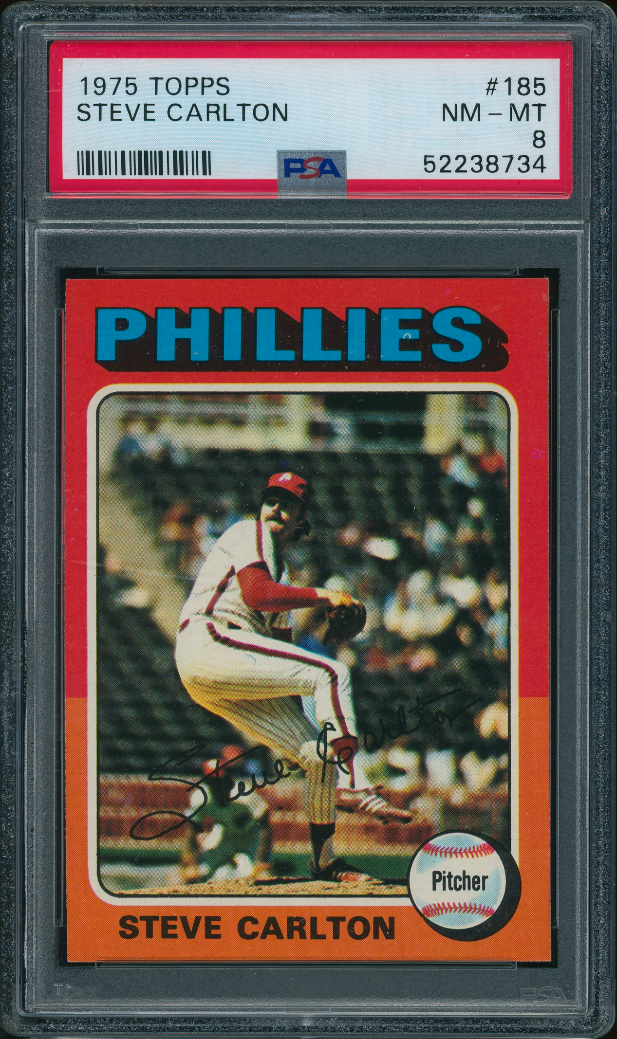 Home / Shop / Cards / Baseball / Phillies / 1975 Topps #185 Steve Carlton PSA 8 NM-MT1975 Topps #185 Steve Carlton PSA 8 NM-MTRelated products Baseball , Cards 1993 Bowman #511 Derek Jeter RC Yankees PSA 10 Gem MT All-Star Cups , Baseball 1968 Topps #45 Tom Seaver Mets PSA 8.5 Baseball , Cards 1980 Topps #600 Reggie Jackson Yankees PSA 9 MINT All-Star Cups , Baseball 1969 Topps #95 Johnny Bench All-Star Rookie Reds PSA 8++ Centered