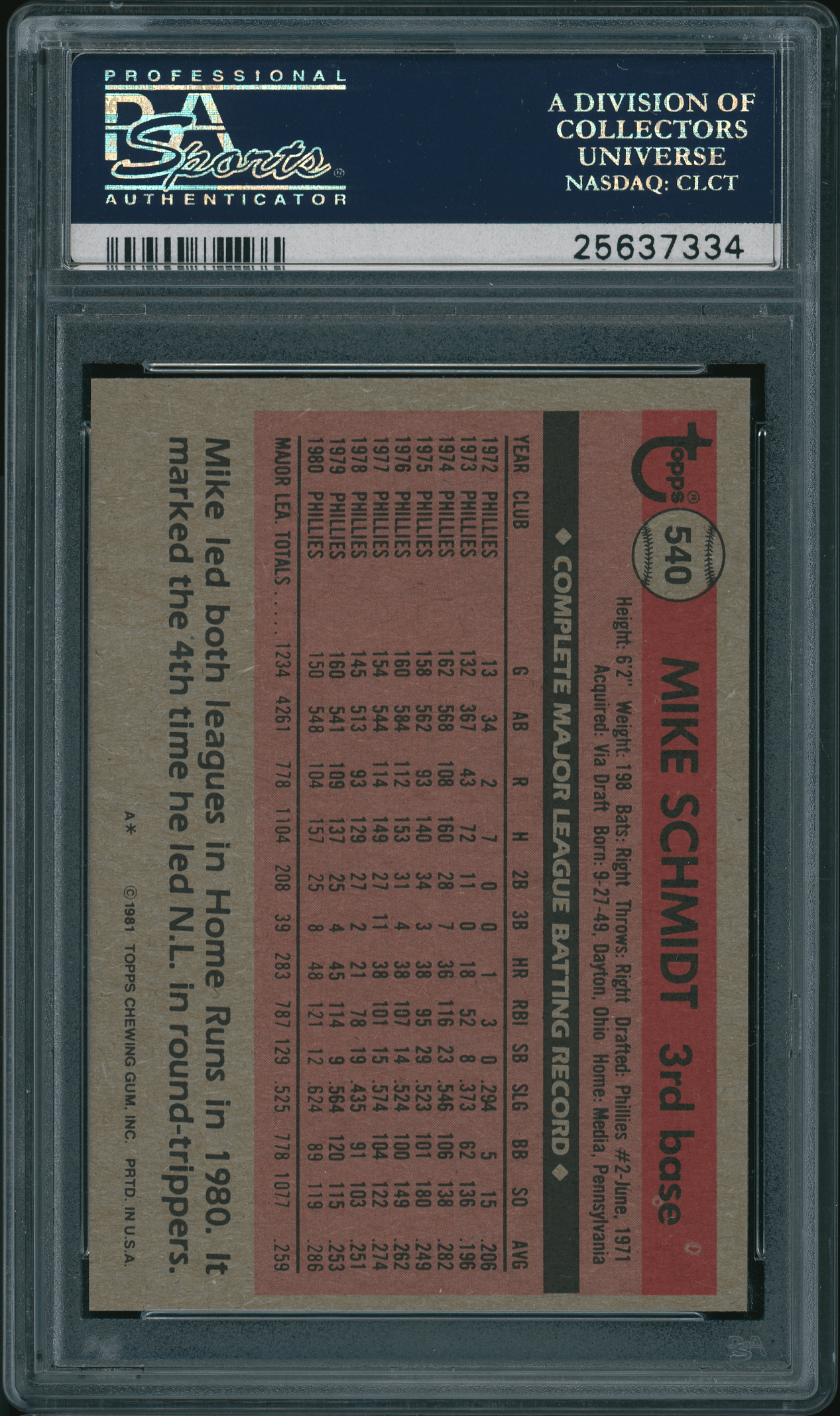 1981 Topps #540 Mike Schmidt PSA 9 MINT