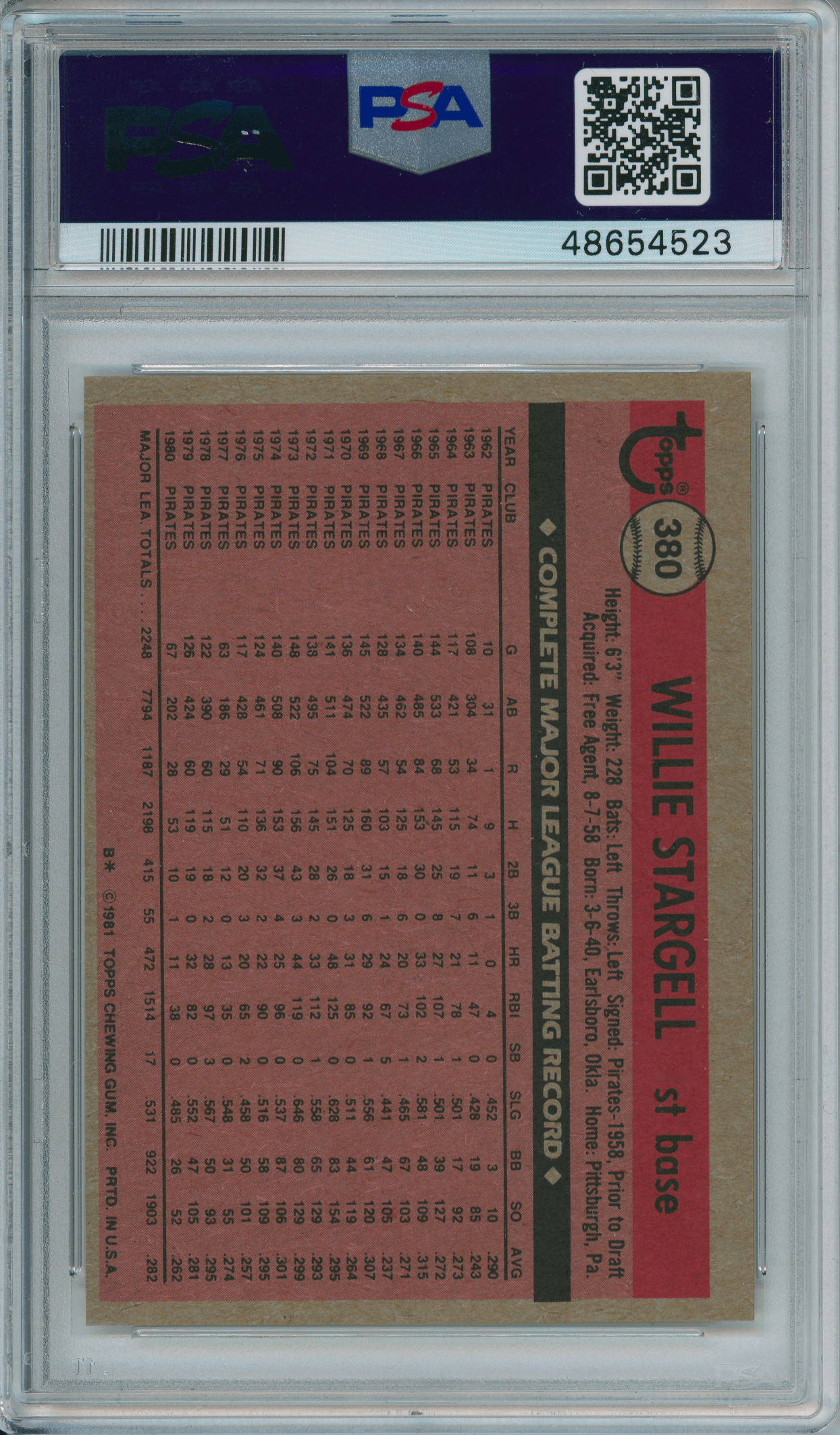 Home / Shop / Cards / Baseball / Pirates / 1981 Topps #380 Willie Stargell PSA 9 MINT1981 Topps #380 Willie Stargell PSA 9 MINTRelated products All-Star Cups , Baseball 1968 Topps #45 Tom Seaver Mets PSA 8.5 All-Star Cups , Angels 2013 Topps Heritage #430 Mike Trout PSA 10 GEM MT Baseball , Cards 1983 Topps #163 Cal Ripken Jr. Orioles PSA 10 GEM MT Baseball , Cards 1977 Topps #640 Carlton Fisk Red Sox PSA 9 MINT