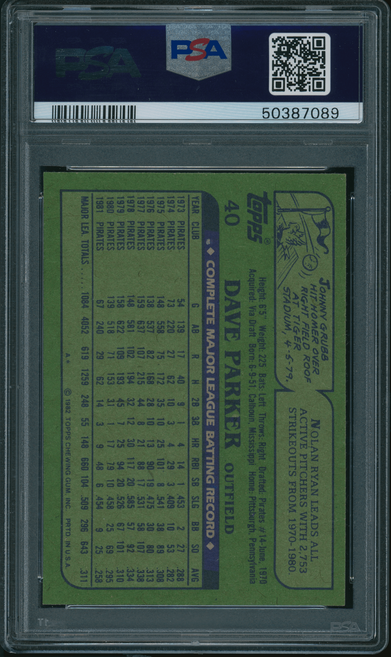 Home / Shop / Cards / Baseball / Pirates / 1982 Topps #40 Dave Parker PSA 9++ MINT (089)1982 Topps #40 Dave Parker PSA 9++ MINT (089)Related products Baseball , Cards 1977 Topps #450 Pete Rose Reds PSA 9 MINT All-Star Cups , Baseball 2019 Topps Heritage #413 Gleyber Torres Purple Refractor PSA 10 GEM MT Baseball , Cards 1970 Kelloggs #7 Tom Seaver Mets PSA 10 GEM MT Baseball , Cards 1989 Bowman #211 Tino Martinez RC Yankees PSA 10 GEM MT