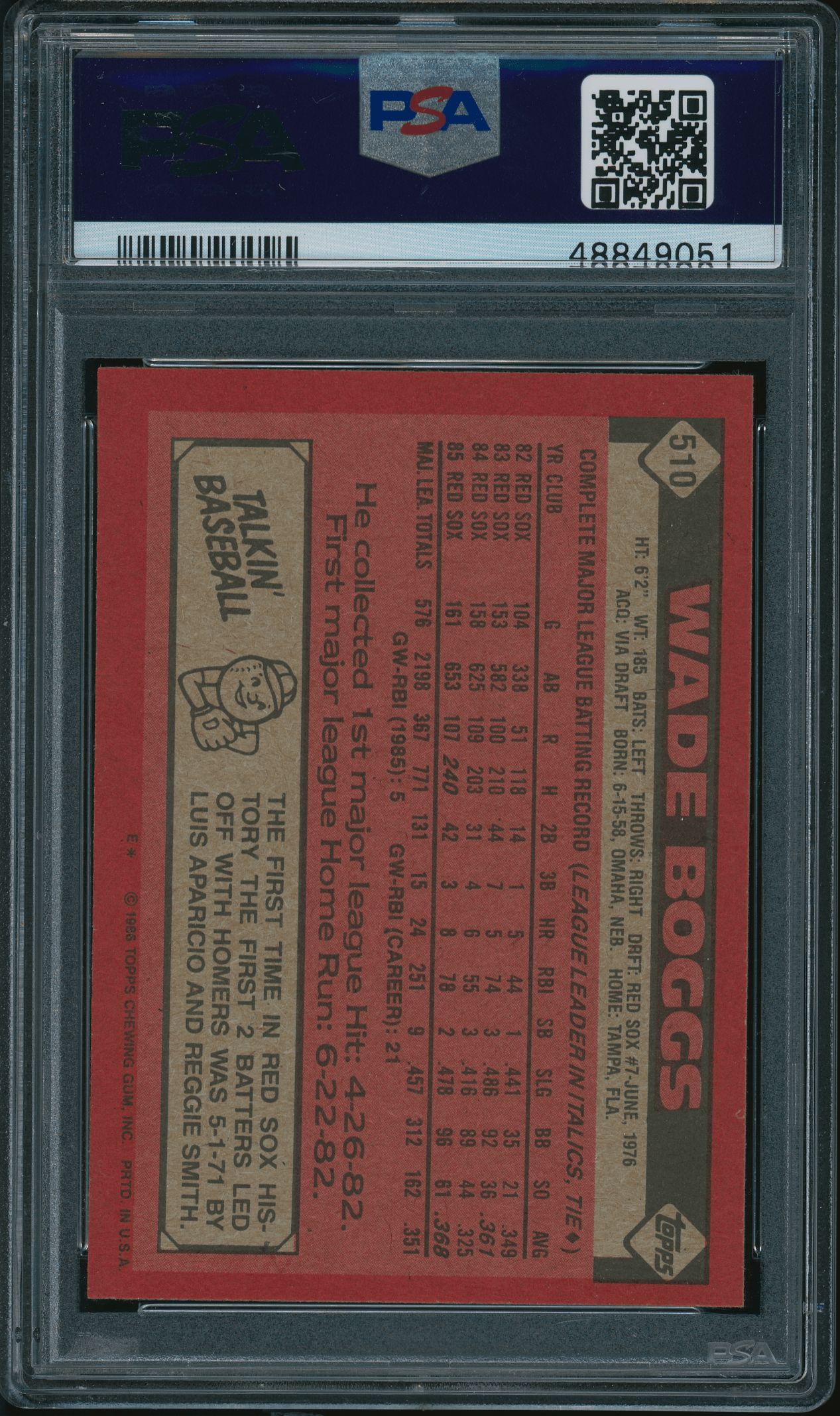 1986 Topps #510 Wade Boggs PSA 9 MINT