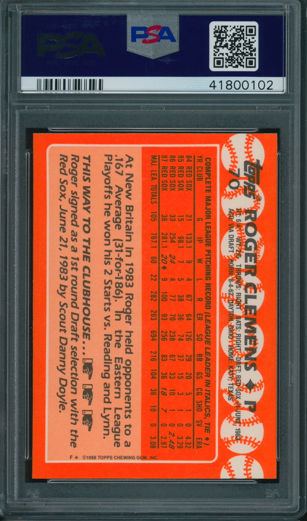 Home / Shop / Cards / Baseball / Red Sox / 1988 Topps Tiffany #70 Roger Clemens PSA 10 GEM MINT1988 Topps Tiffany #70 Roger Clemens PSA 10 GEM MINTRelated products Baseball , Cards 1961 Topps #2 Roger Maris Yankees PSA 8++ Centered Baseball , Cards 1970 Kelloggs #7 Tom Seaver Mets PSA 10 GEM MT Baseball , Cards 1989 Bowman #211 Tino Martinez RC Yankees PSA 10 GEM MT Baseball , Cards 1973 Topps #627 Luis Alvarado White Sox PSA 8++ Centered