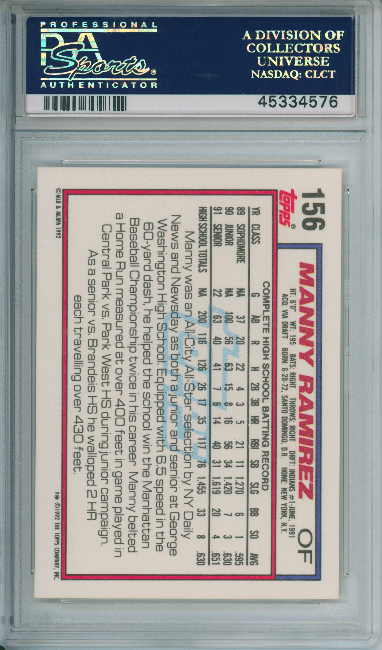 1992 Topps #156 Manny Ramirez RC Rookie PSA 10 GEM MINT