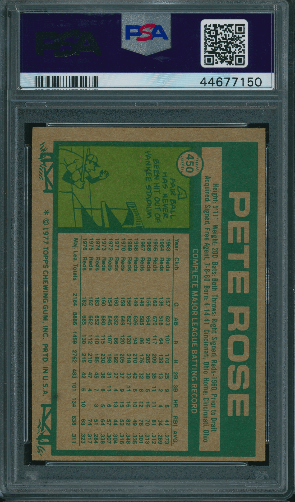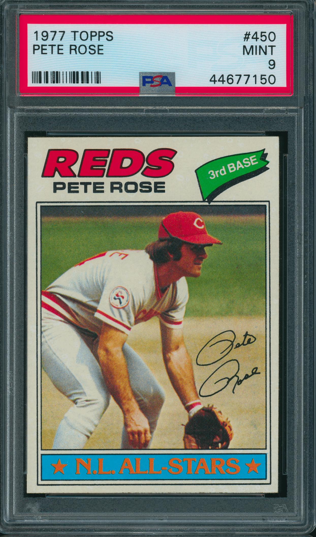 Home / Shop / Cards / Baseball / Reds / 1977 Topps #450 Pete Rose Reds PSA 9 MINT1977 Topps #450 Pete Rose Reds PSA 9 MINTRelated products All-Star Cups , Baseball 1968 Topps #45 Tom Seaver Mets PSA 8.5 Baseball , Cards 1977 Topps #640 Carlton Fisk Red Sox PSA 9 MINT Baseball , Cards 1990 Topps Tiffany #210 Ryne Sandberg Cubs PSA 10 GEM MT Baseball , Cards 1961 Topps #2 Roger Maris Yankees PSA 8++ Centered