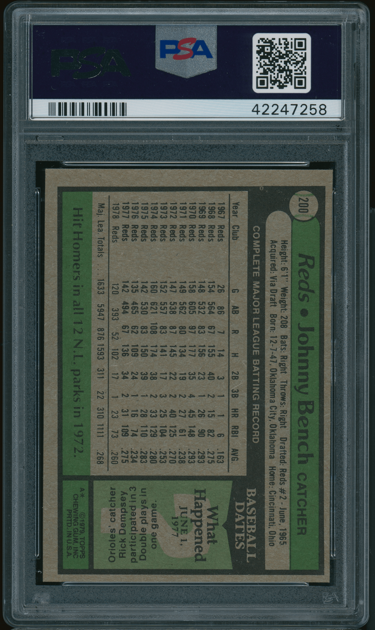 Home / Shop / Cards / Baseball / Reds / 1979 Topps #200 Johnny Bench PSA 9 MINT1979 Topps #200 Johnny Bench PSA 9 MINTRelated products Baseball , Cards 1988 Topps Big #11 Dwight Gooden PSA 10 GEM MT All-Star Cups , Baseball 1969 Topps #95 Johnny Bench All-Star Rookie Reds PSA 8++ Centered Baseball , Cards 1977 Topps #450 Pete Rose Reds PSA 9 MINT Baseball , Cards 1990 Topps Tiffany #210 Ryne Sandberg Cubs PSA 10 GEM MT