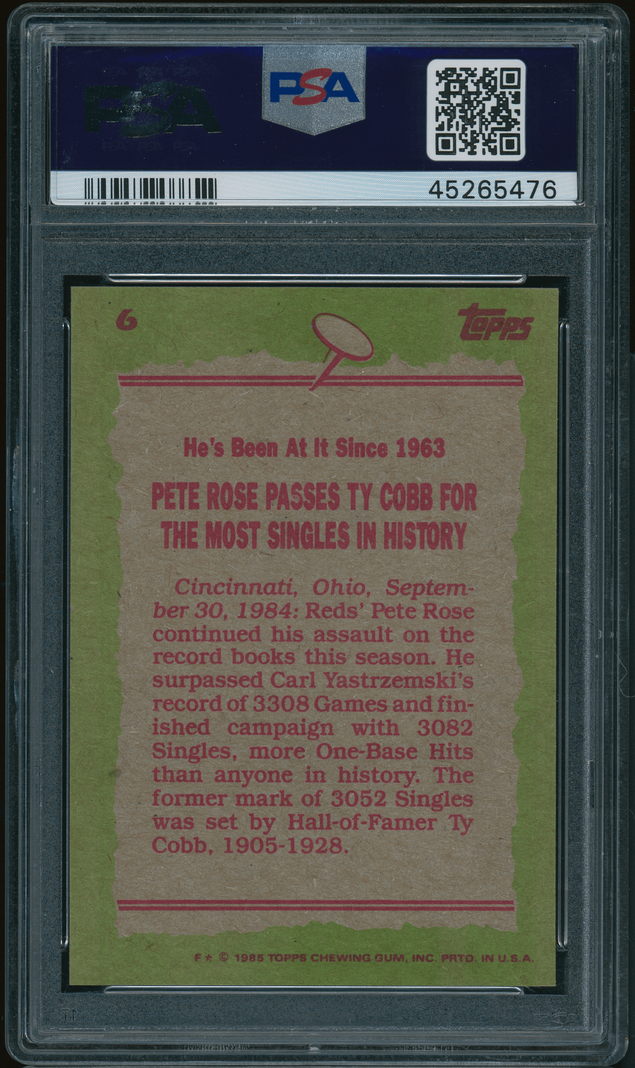 Home / Shop / Cards / Baseball / Reds / 1985 Topps #6 Pete Rose PSA 10 GEM MINT1985 Topps #6 Pete Rose PSA 10 GEM MINTRelated products Baseball , Cards 1961 Topps #2 Roger Maris Yankees PSA 8++ Centered All-Star Cups , Angels 2013 Topps Heritage #430 Mike Trout PSA 10 GEM MT Baseball , Cards 1977 Topps #640 Carlton Fisk Red Sox PSA 9 MINT Baseball , Cards 1970 Kelloggs #7 Tom Seaver Mets PSA 10 GEM MT