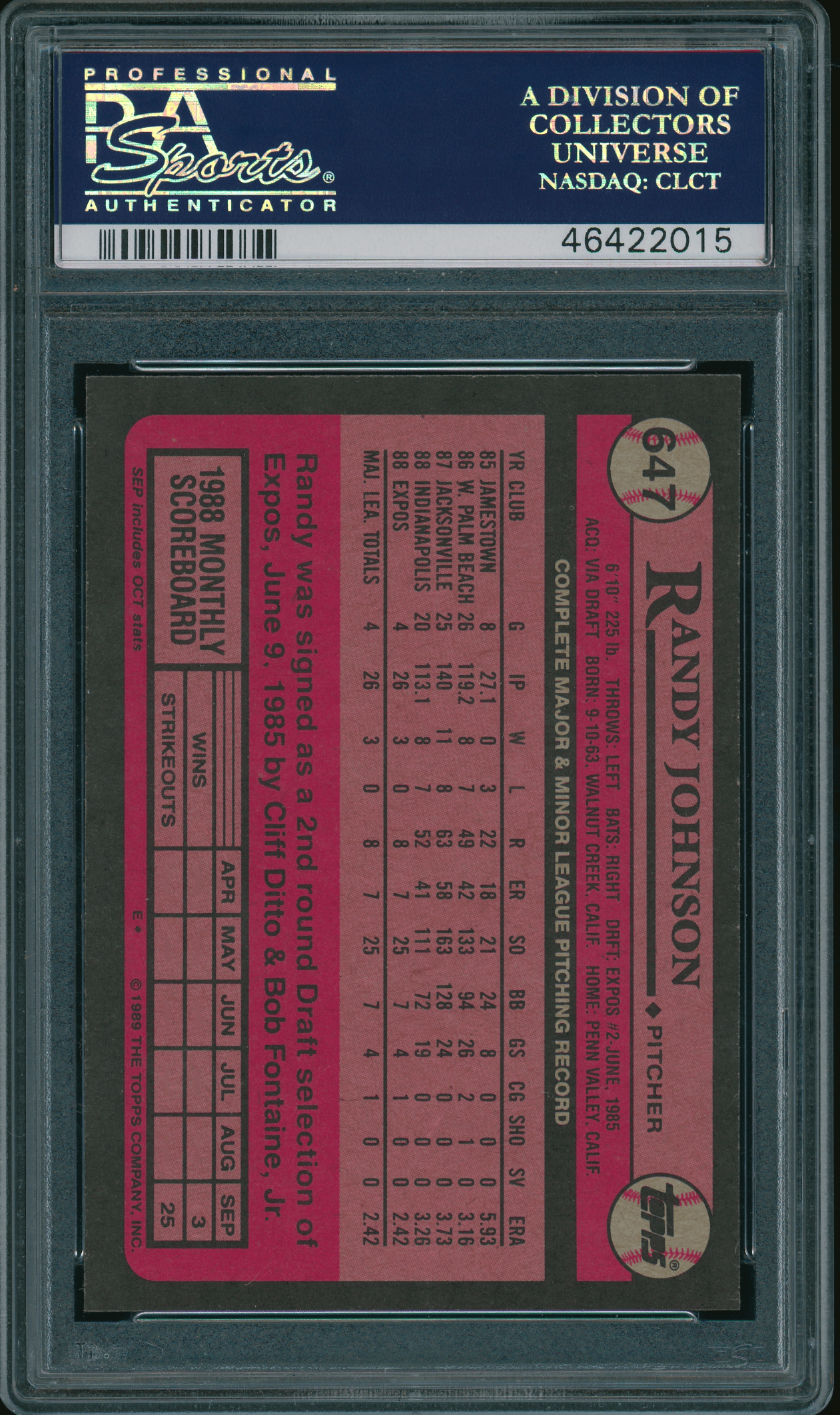 Home / Shop / Cards / Baseball / Rookie Cards / 1989 Topps #647 Randy Johnson RC Rookie PSA 10 GEM MINT1989 Topps #647 Randy Johnson RC Rookie PSA 10 GEM MINTRelated products All-Star Cups , Baseball 2019 Topps Heritage #413 Gleyber Torres Purple Refractor PSA 10 GEM MT Baseball , Cards 1984 Topps Traded #42T Dwight Gooden RC Rookie PSA 10 GEM MT Baseball , Cards 1980 Topps #600 Reggie Jackson Yankees PSA 9 MINT Baseball , Cards 1961 Topps #388 Roberto Clemente Pirates PSA 8++ Centered1961 Topps #388 Roberto Clemente Pirates PSA 8++ Centered