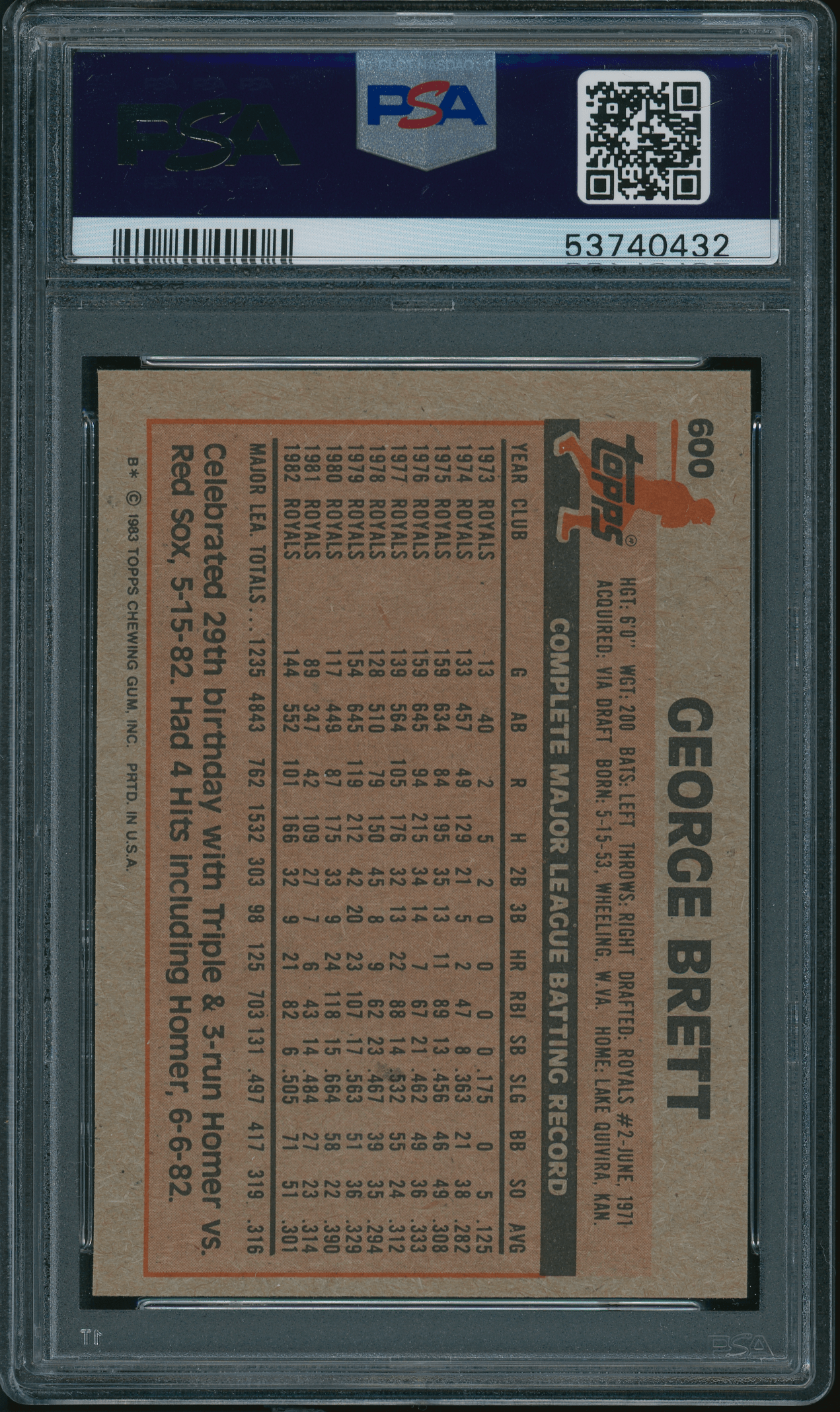 Home / Shop / Cards / Baseball / Royals / 1983 Topps #600 George Brett PSA 9 MINT1983 Topps #600 George Brett PSA 9 MINTRelated products Baseball , Cards 1988 Topps Big #11 Dwight Gooden PSA 10 GEM MT Baseball , Cards 1958 Topps #370 Yogi Berra Yankees PSA 8++ Centered Baseball , Cards 1986 Topps Tiffany #159 Orel Hershiser Dodgers PSA 9 MINT All-Star Cups , Baseball 1968 Topps #45 Tom Seaver Mets PSA 8.5