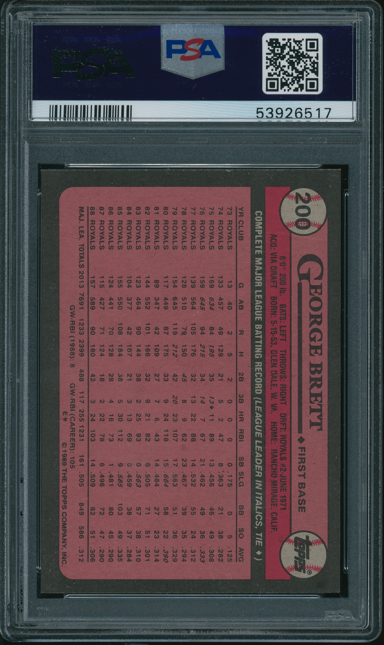 Home / Shop / Cards / Baseball / Royals / 1989 Topps #200 George Brett PSA 10 GEM MINT1989 Topps #200 George Brett PSA 10 GEM MINTRelated products Baseball , Cards 2019 Topps Living #259 Thurman Munson Yankees PSA 10 GEM MT All-Star Cups , Angels 2013 Topps Heritage #430 Mike Trout PSA 10 GEM MT Baseball , Cards 1961 Topps #2 Roger Maris Yankees PSA 8++ Centered All-Star Cups , Baseball 1969 Topps #95 Johnny Bench All-Star Rookie Reds PSA 8++ Centered