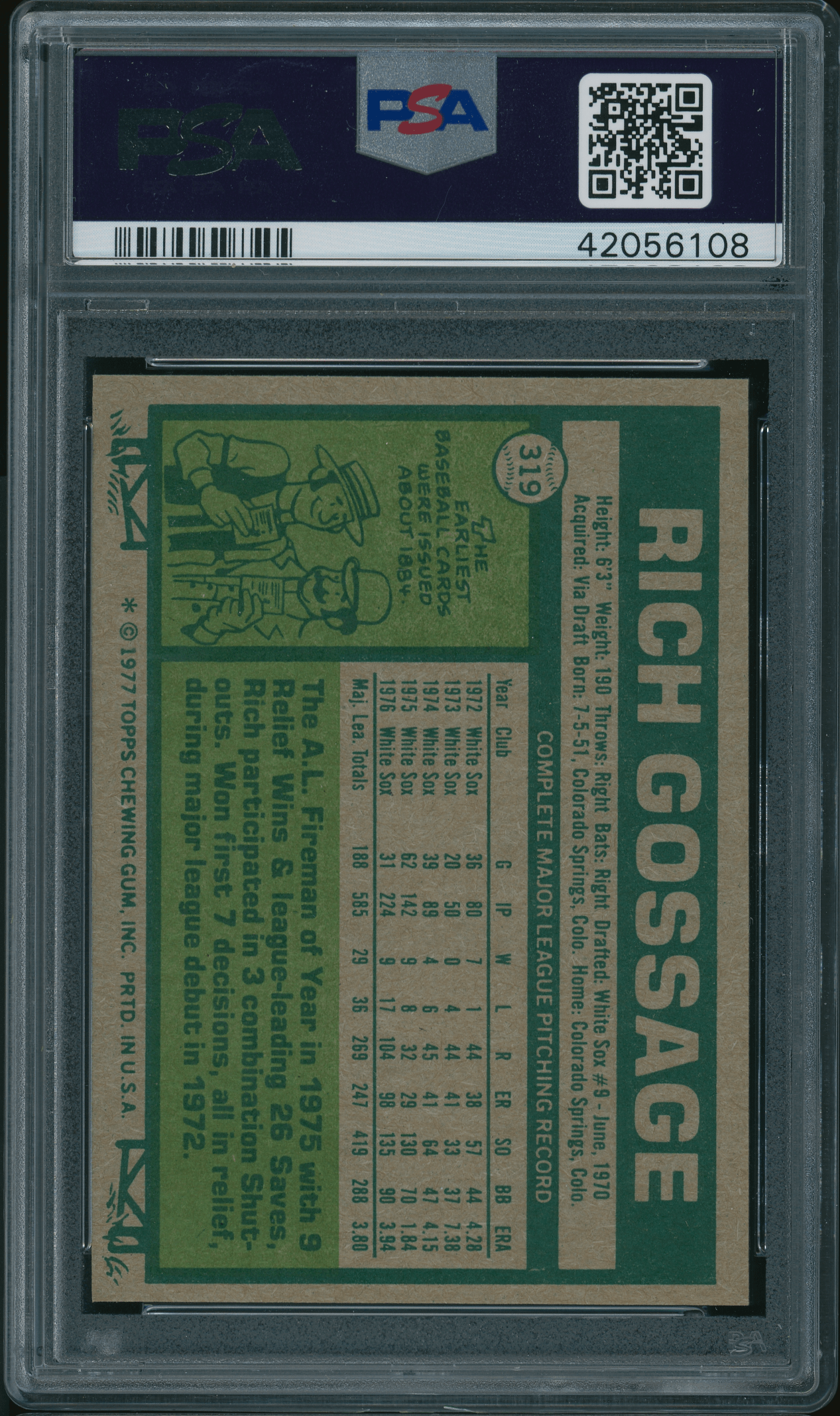 Home / Shop / Cards / Baseball / White Sox / 1977 Topps #319 Rich Gossage PSA 9 MINT1977 Topps #319 Rich Gossage PSA 9 MINTRelated products Baseball , Cards 1970 Kelloggs #7 Tom Seaver Mets PSA 10 GEM MT Baseball , Cards 1977 Topps #640 Carlton Fisk Red Sox PSA 9 MINT Baseball , Cards 1980 Topps #600 Reggie Jackson Yankees PSA 9 MINT Baseball , Cards 1961 Topps #2 Roger Maris Yankees PSA 8++ Centered