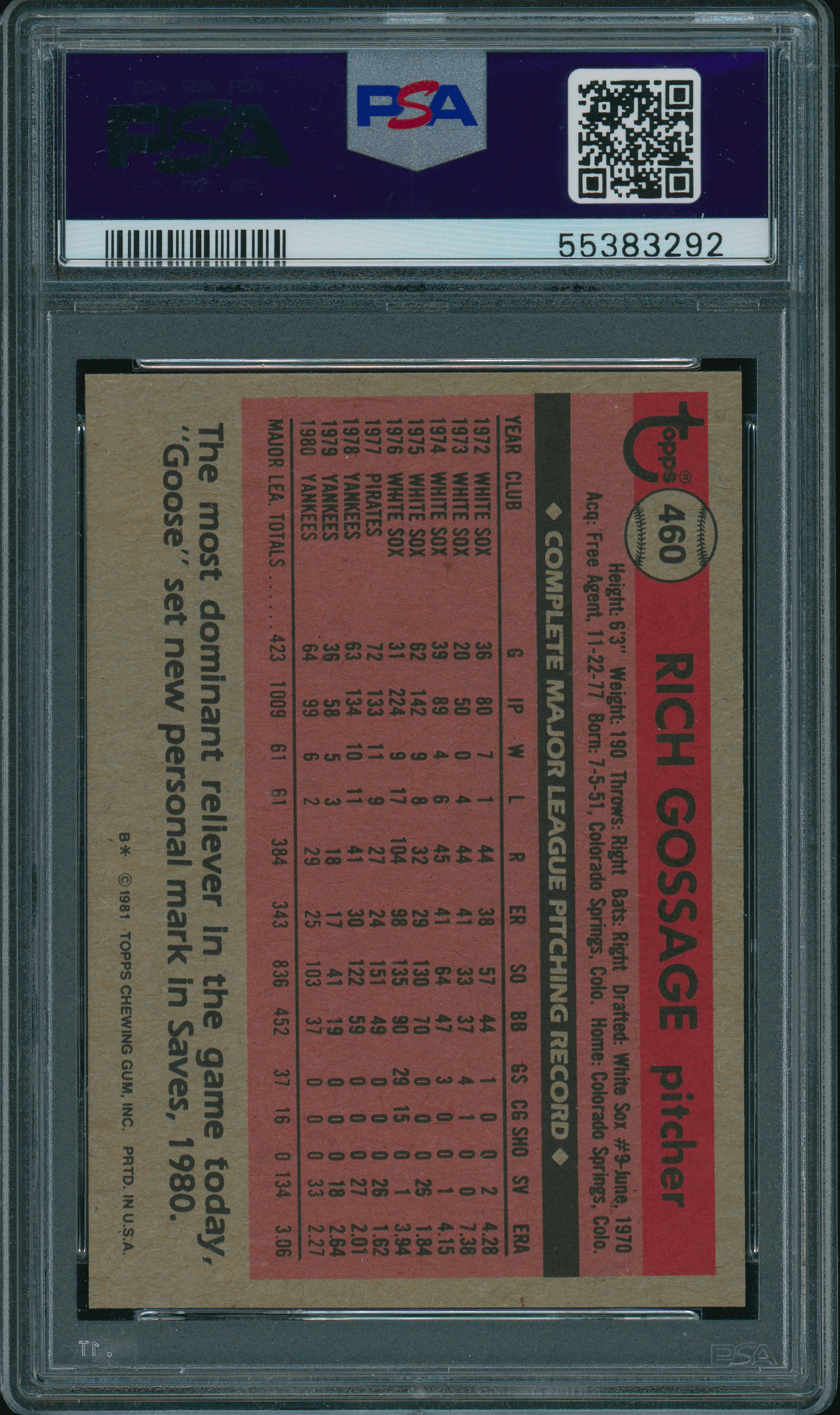 Home / Shop / Cards / Baseball / Yankees / 1981 Topps #460 Rich Gossage PSA 10 GEM MINT1981 Topps #460 Rich Gossage PSA 10 GEM MINTRelated products Baseball , Cards 1977 Topps #640 Carlton Fisk Red Sox PSA 9 MINT Baseball , Cards 1977 Topps #10 Reggie Jackson Yankees PSA 9 MINT Baseball , Cards 1988 Topps Big #11 Dwight Gooden PSA 10 GEM MT Baseball , Cards 1970 Kelloggs #7 Tom Seaver Mets PSA 10 GEM MT