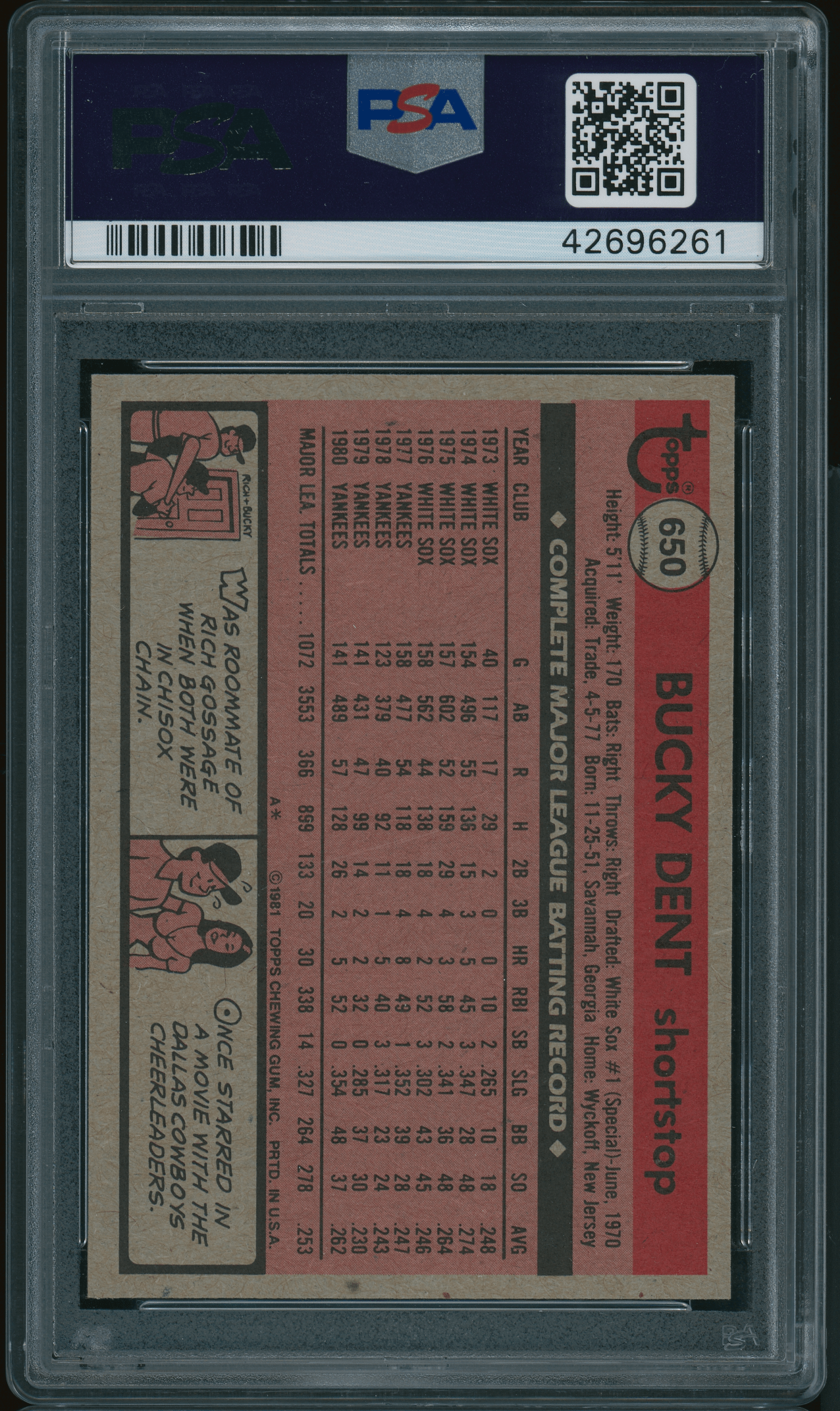 Home / Shop / Cards / Baseball / Yankees / 1981 Topps #650 Buckey Dent PSA 9 MINT1981 Topps #650 Buckey Dent PSA 9 MINTRelated products Baseball , Cards 1961 Topps #388 Roberto Clemente Pirates PSA 8++ Centered1961 Topps #388 Roberto Clemente Pirates PSA 8++ Centered All-Star Cups , Baseball 2019 Topps Heritage #413 Gleyber Torres Purple Refractor PSA 10 GEM MT Baseball , Cards 1983 Topps #580 Tom Seaver Reds PSA 10 GEM MT Baseball , Cards 1984 Topps Traded #42T Dwight Gooden RC Rookie PSA 10 GEM MT