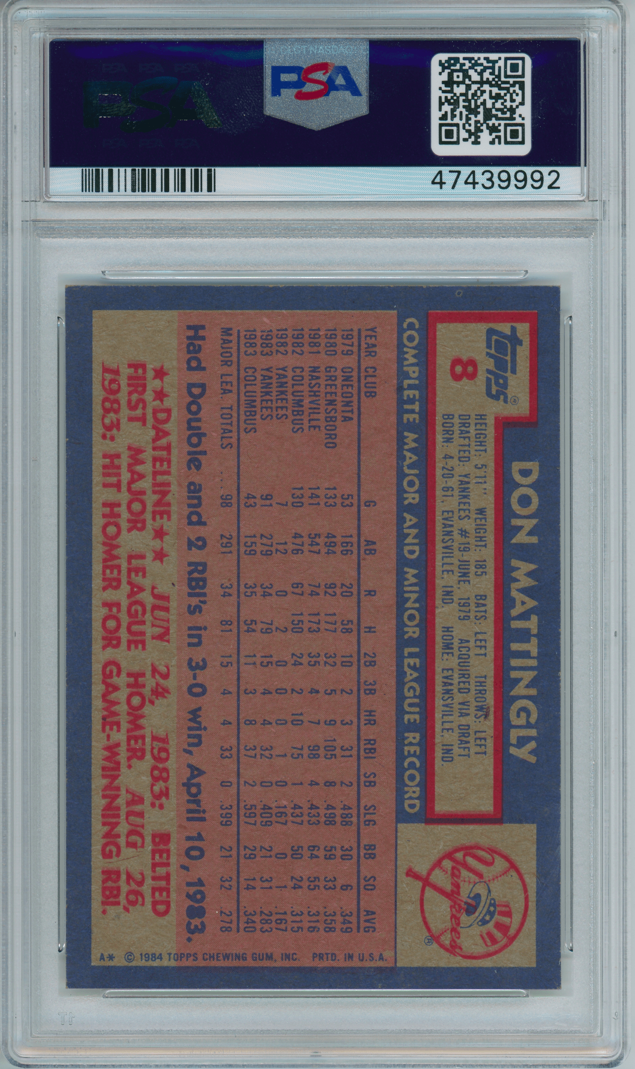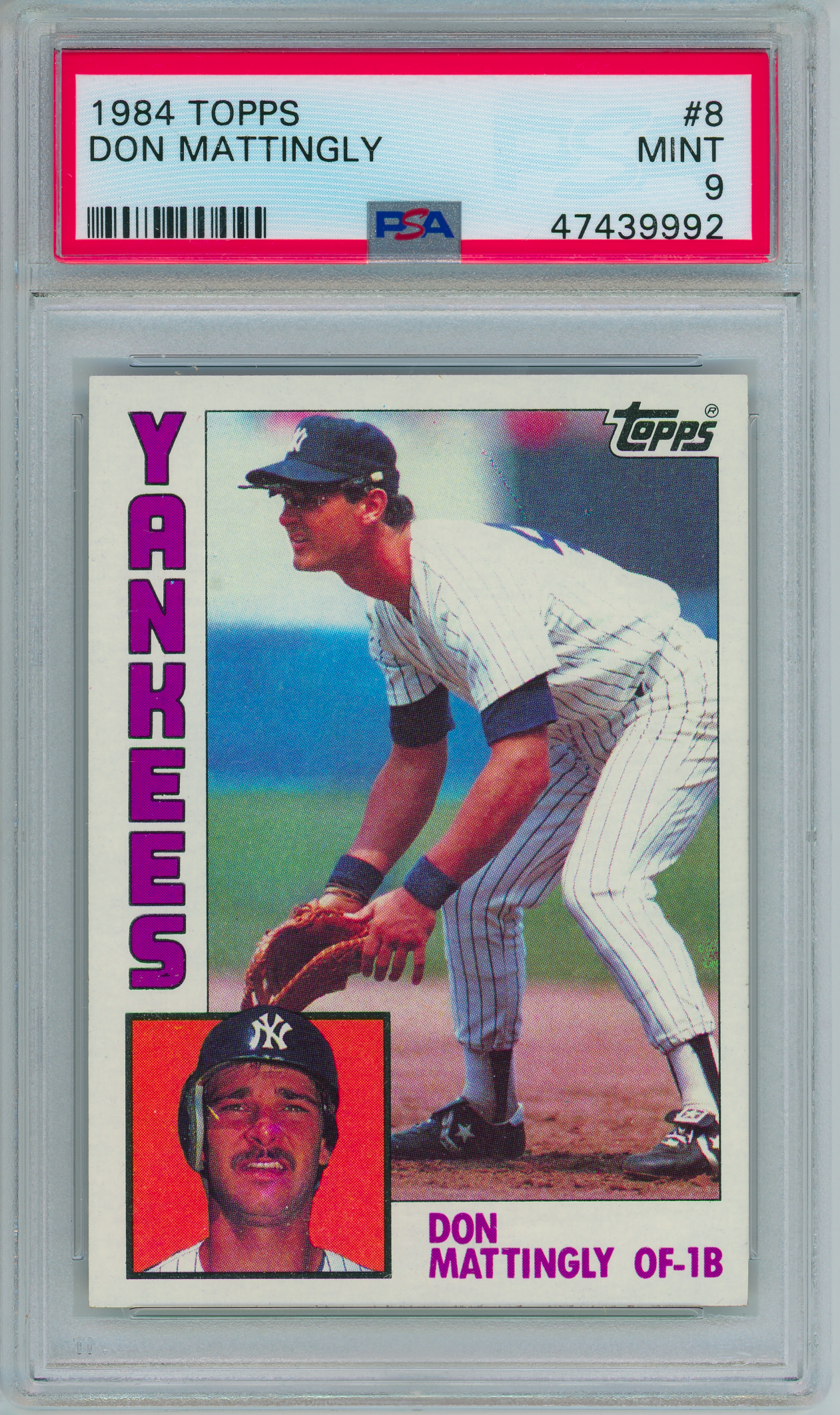 Home / Shop / Cards / Baseball / Yankees / 1984 Topps #8 Don Mattingly RC Rookie PSA 9 MINT1984 Topps #8 Don Mattingly RC Rookie PSA 9 MINTRelated products Baseball , Cards 1970 Kelloggs #7 Tom Seaver Mets PSA 10 GEM MT Baseball , Cards 1977 Topps #450 Pete Rose Reds PSA 9 MINT All-Star Cups , Baseball 1968 Topps #45 Tom Seaver Mets PSA 8.5 All-Star Cups , Baseball 2019 Topps Heritage #413 Gleyber Torres Purple Refractor PSA 10 GEM MT