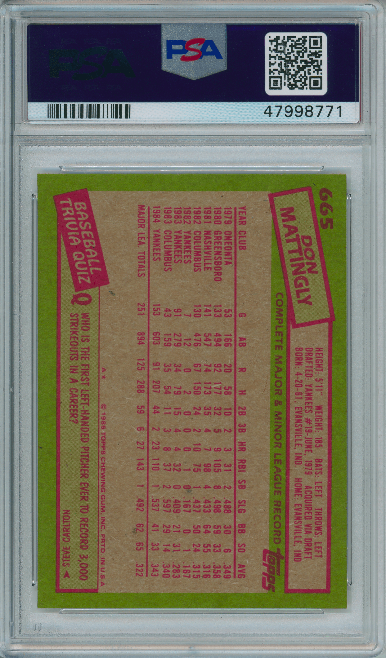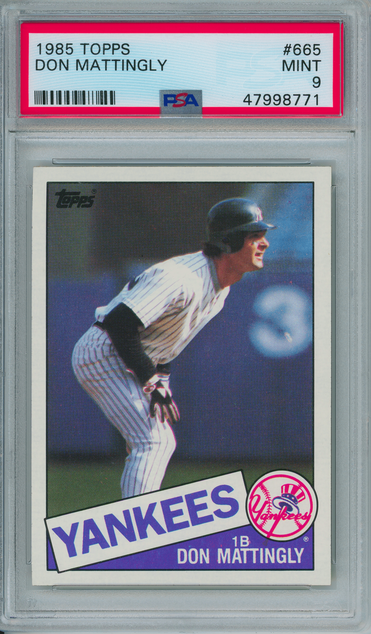 Home / Shop / Cards / Baseball / Yankees / 1985 Topps #665 Don Mattingly PSA 9 MINT1985 Topps #665 Don Mattingly PSA 9 MINTRelated products All-Star Cups , Baseball 2019 Topps Heritage #413 Gleyber Torres Purple Refractor PSA 10 GEM MT Baseball , Cards 1961 Topps #2 Roger Maris Yankees PSA 8++ Centered Baseball , Cards 1977 Topps #640 Carlton Fisk Red Sox PSA 9 MINT Baseball , Cards 1984 Topps Traded #42T Dwight Gooden RC Rookie PSA 10 GEM MT