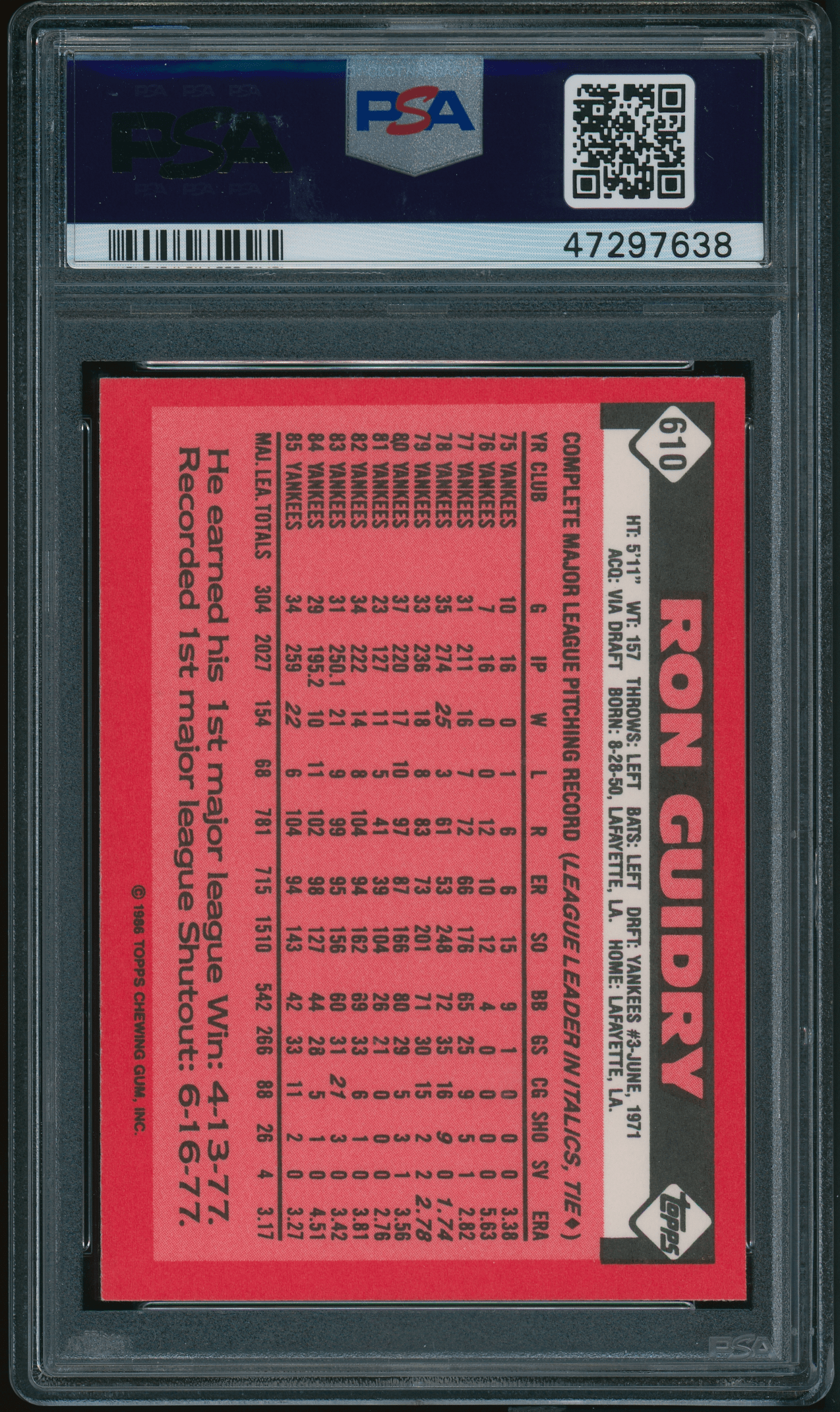 1986 Topps Tiffany #610 Ron Guidry PSA 9 MINT