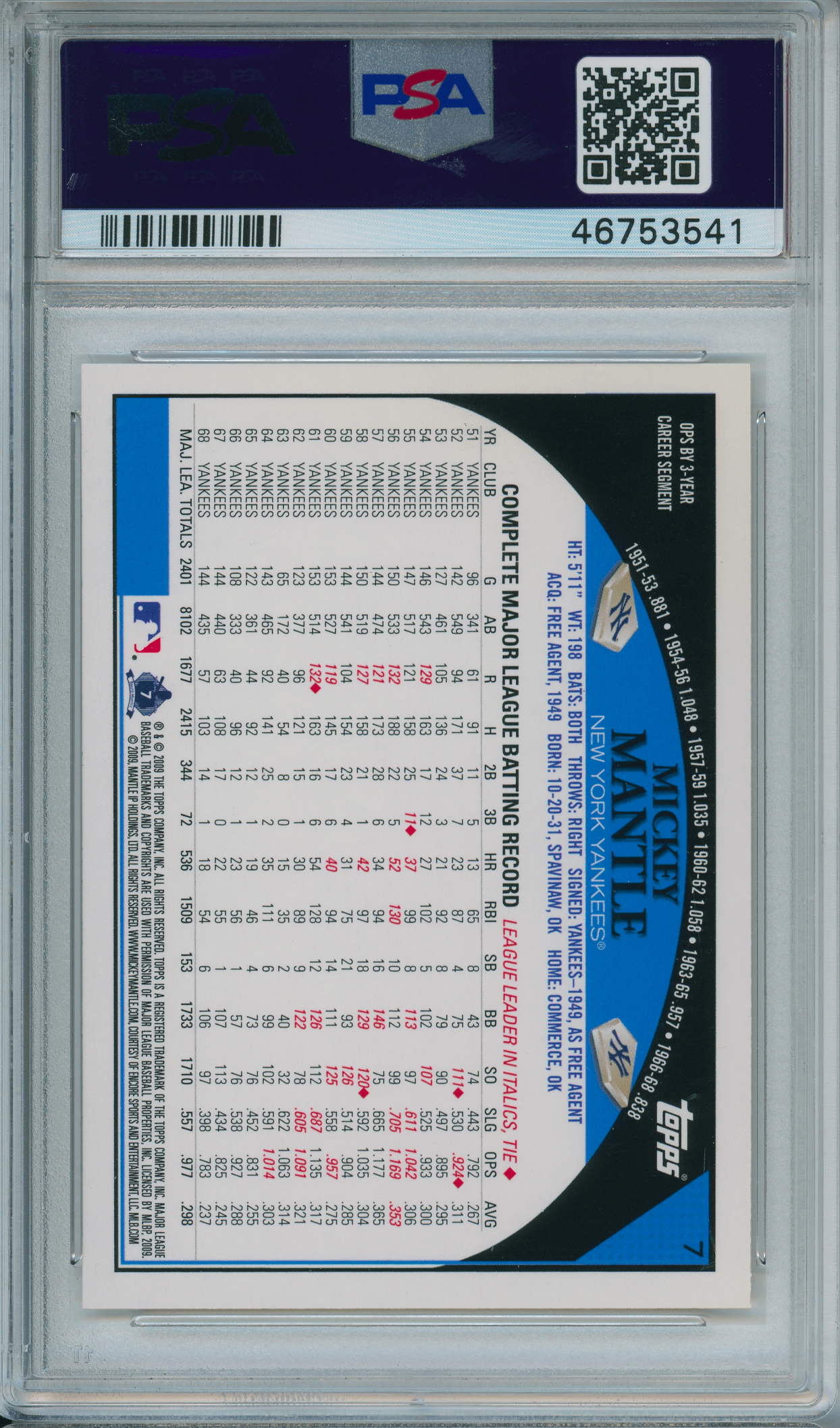 Home / Shop / Cards / Baseball / Yankees / 2009 Topps #7 Mickey Mantle PSA 10 GEM MINT2009 Topps #7 Mickey Mantle PSA 10 GEM MINTRelated products Baseball , Cards 1990 Topps Tiffany #210 Ryne Sandberg Cubs PSA 10 GEM MT Athletics , Baseball 1974 Topps #290 Vida Blue Athletics PSA 9 MINT All-Star Cups , Baseball 2019 Topps Heritage #413 Gleyber Torres Purple Refractor PSA 10 GEM MT Baseball , Cards 1970 Kelloggs #7 Tom Seaver Mets PSA 10 GEM MT